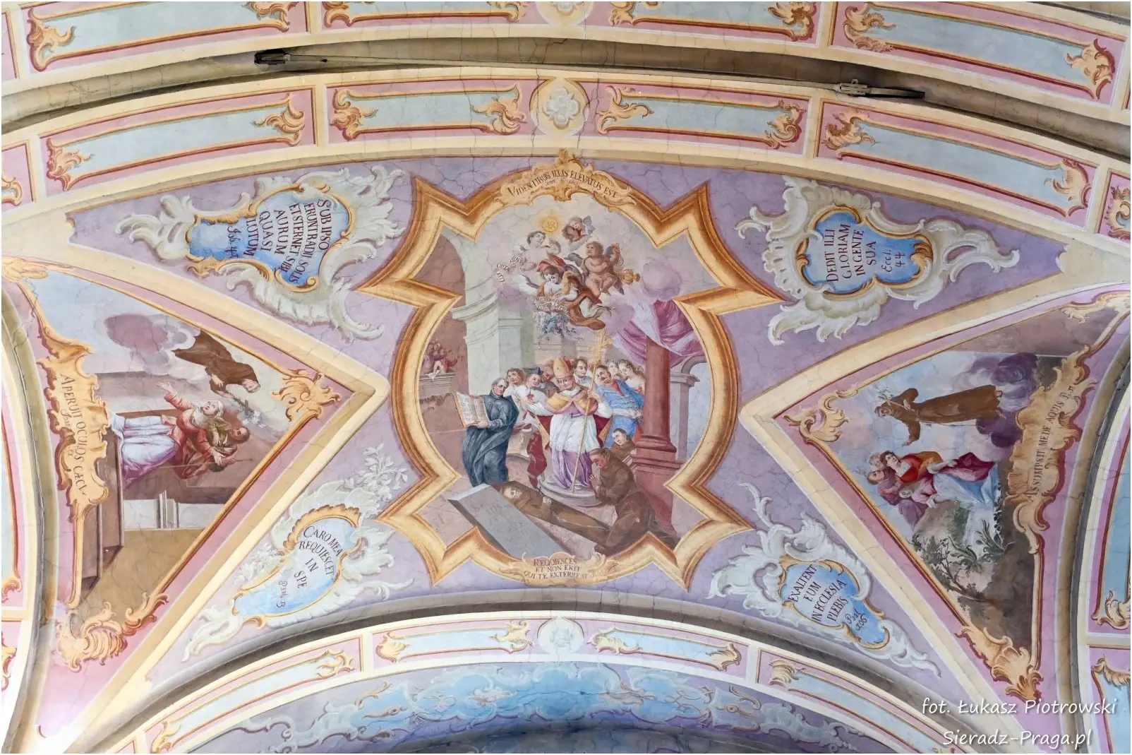 Malarze ukazują na polichromiach sklepień warckiego klasztoru sceny m.in. Wniebowzięcia NMP i dziewięć chórów anielskich, adorację Chrystusa Ukrzyżowanego przez świętych i aniołów, wizję Nieba z polskimi świętymi i błogosławionymi. Jest również ukazane na sklepieniach życie i cuda Sługi Bożego Rafała z Proszowic, którego kult trwa nieprzerwanie od XVI wieku, a w kaplicy św. Anny możemy podziwiać sceny z życia matki Maryi, a zarazem babci Jezusa i personifikacje czterech cnót kardynalnych. W tym miejscu kieruję podziękowania dla mojego serdecznego kolegi dr. hab Pawła Migasiewicza, sieradzanina, a zarazem profesora pracującego w Polskiej Akademii Nauk w Warszawie za zawsze okazywaną mi pomoc.