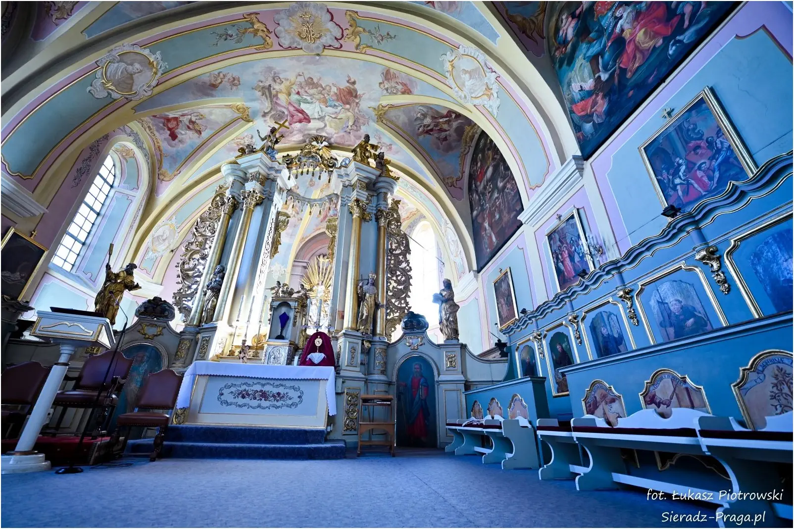 Dzisiaj pragnę przenieść się do niezwykłego miejsca, które jest oddalone od Sieradza jedynie o kilkanaście kilometrów. Tym miejscem jest wszystkim dobrze znany klasztor Ojców Bernardynów w Warcie, który jest również parafią pw. Najświętszej Maryi Panny. W ostatnich latach to miejsce stało mi się bliższe, a to za sprawą sąsiadujących z nim Sióstr Bernardynek, które 16 czerwca 2023 roku „ za sprawą” klasztoru Ojców Bernardynów mogłem pierwszy raz poznać. Od tamtego czasu stałem się częstszym bywalcem tych bliskich mojemu sercu miejsc. W klasztorze u Ojców Bernardynów bywałem też już wcześniej, a pierwsze zdjęcia z wnętrza kościoła wykonałem 8 listopada 2019 roku. Natomiast 18 września i 14 listopada 2024 roku nagrałem dronem z zewnątrz i wewnątrz kościoła filmy. To wszystko, o czym wspominam, możecie, Drodzy Czytelnicy, obejrzeć, klikając tutaj. Jednak oprócz zdjęć i filmów ukazujących piękno tego miejsca brakowało jeszcze czegoś. Tym brakującym elementem warckiego klasztoru są piękne malowidła ścienne kościoła. I to im pragnę poświęcić obecną zakładkę.