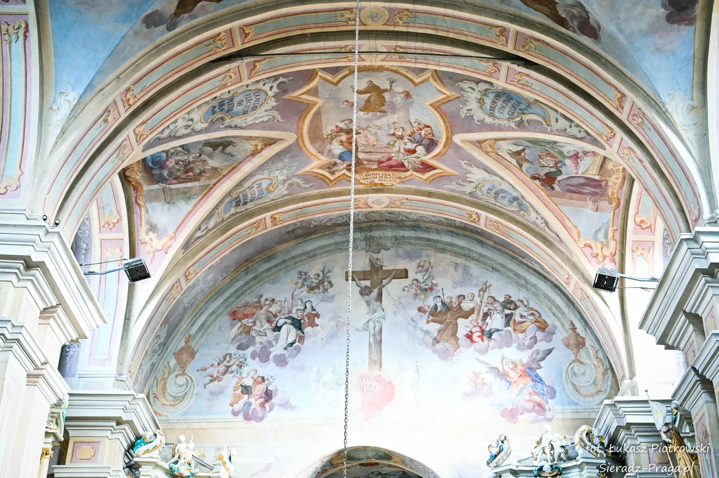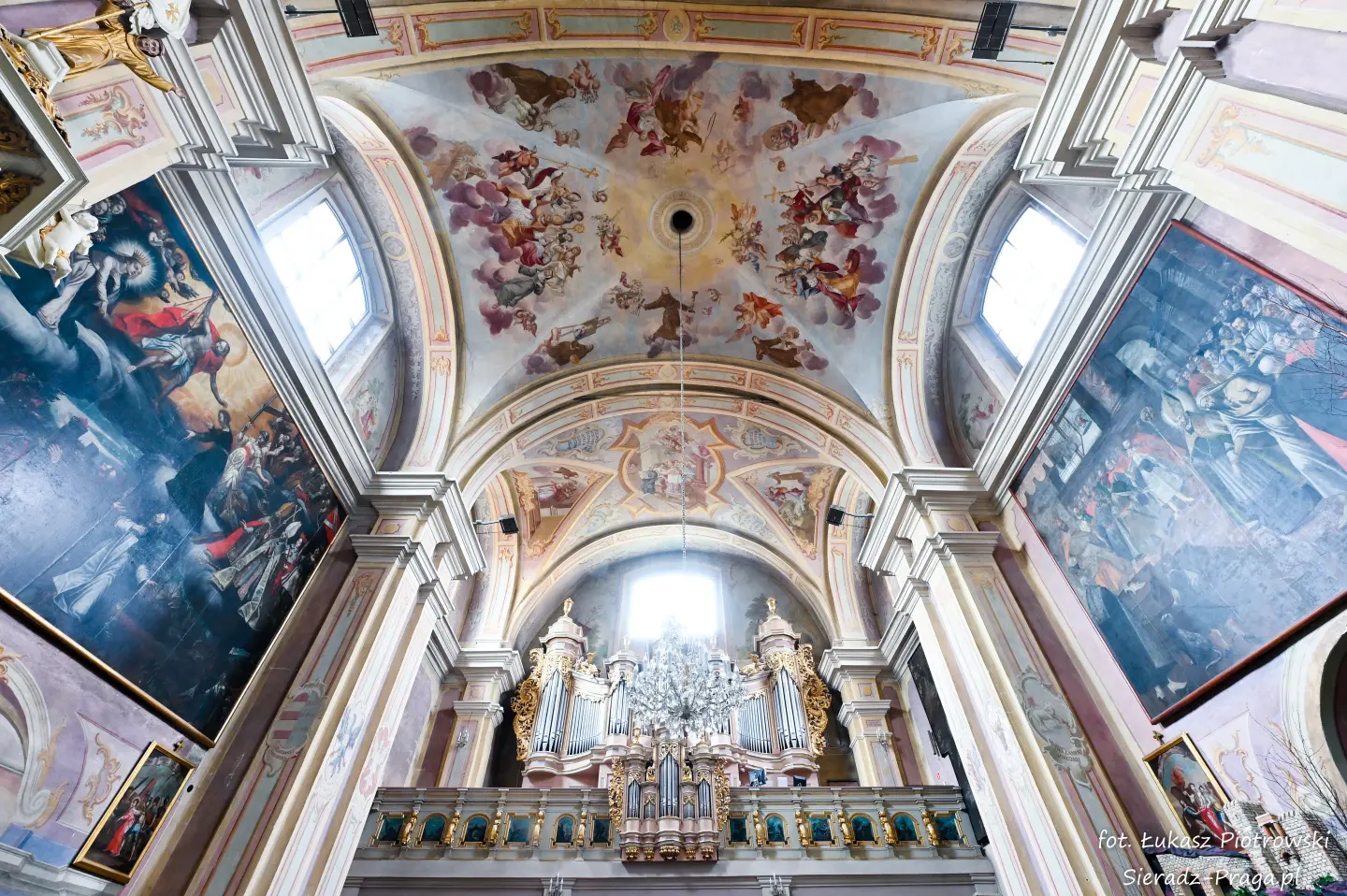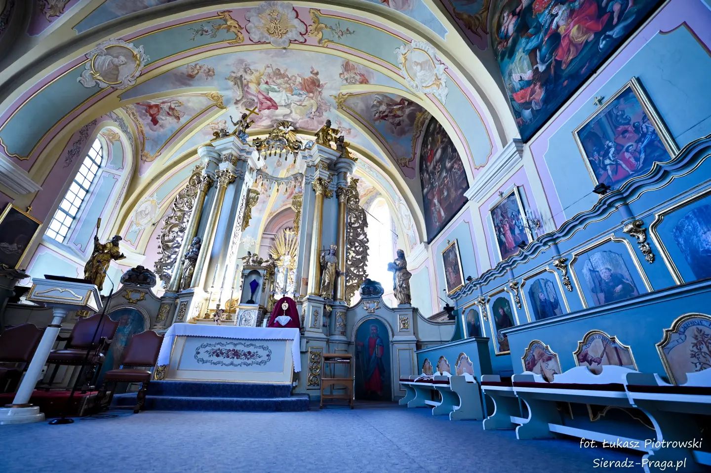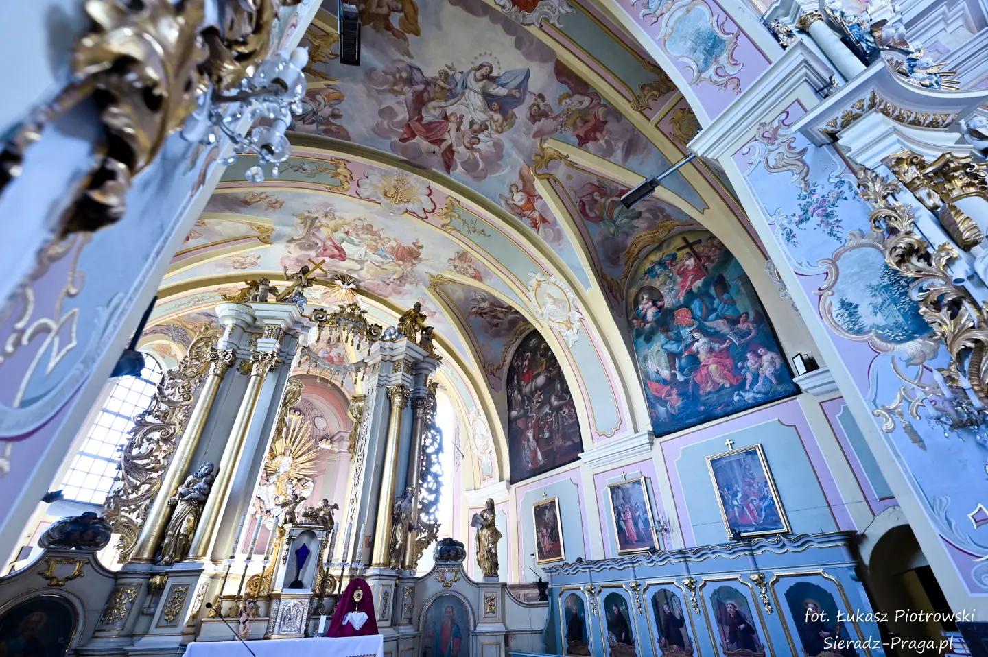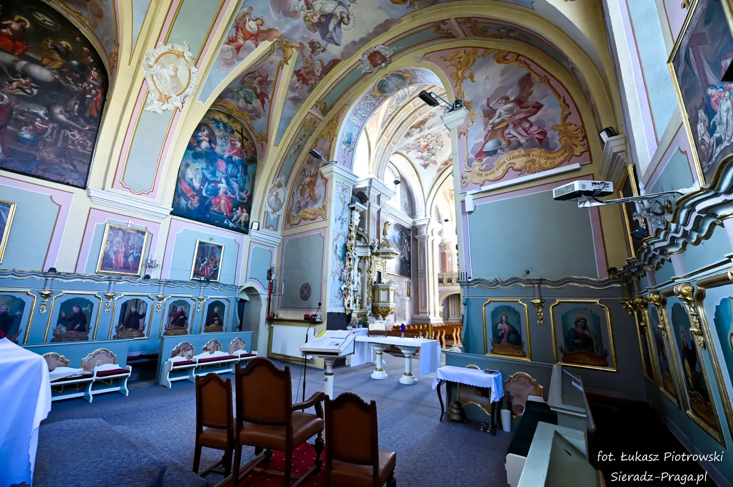 Dzisiaj pragnę przenieść się do niezwykłego miejsca, które jest oddalone od Sieradza jedynie o kilkanaście kilometrów. Tym miejscem jest wszystkim dobrze znany klasztor Ojców Bernardynów w Warcie, który jest również parafią pw. Najświętszej Maryi Panny. W ostatnich latach to miejsce stało mi się bliższe, a to za sprawą sąsiadujących z nim Sióstr Bernardynek, które 16 czerwca 2023 roku „ za sprawą” klasztoru Ojców Bernardynów mogłem pierwszy raz poznać. Od tamtego czasu stałem się częstszym bywalcem tych bliskich mojemu sercu miejsc. W klasztorze u Ojców Bernardynów bywałem też już wcześniej, a pierwsze zdjęcia z wnętrza kościoła wykonałem 8 listopada 2019 roku. Natomiast 18 września i 14 listopada 2024 roku nagrałem dronem z zewnątrz i wewnątrz kościoła filmy. To wszystko, o czym wspominam, możecie, Drodzy Czytelnicy, obejrzeć, klikając tutaj. Jednak oprócz zdjęć i filmów ukazujących piękno tego miejsca brakowało jeszcze czegoś. Tym brakującym elementem warckiego klasztoru są piękne malowidła ścienne kościoła. I to im pragnę poświęcić obecną zakładkę.