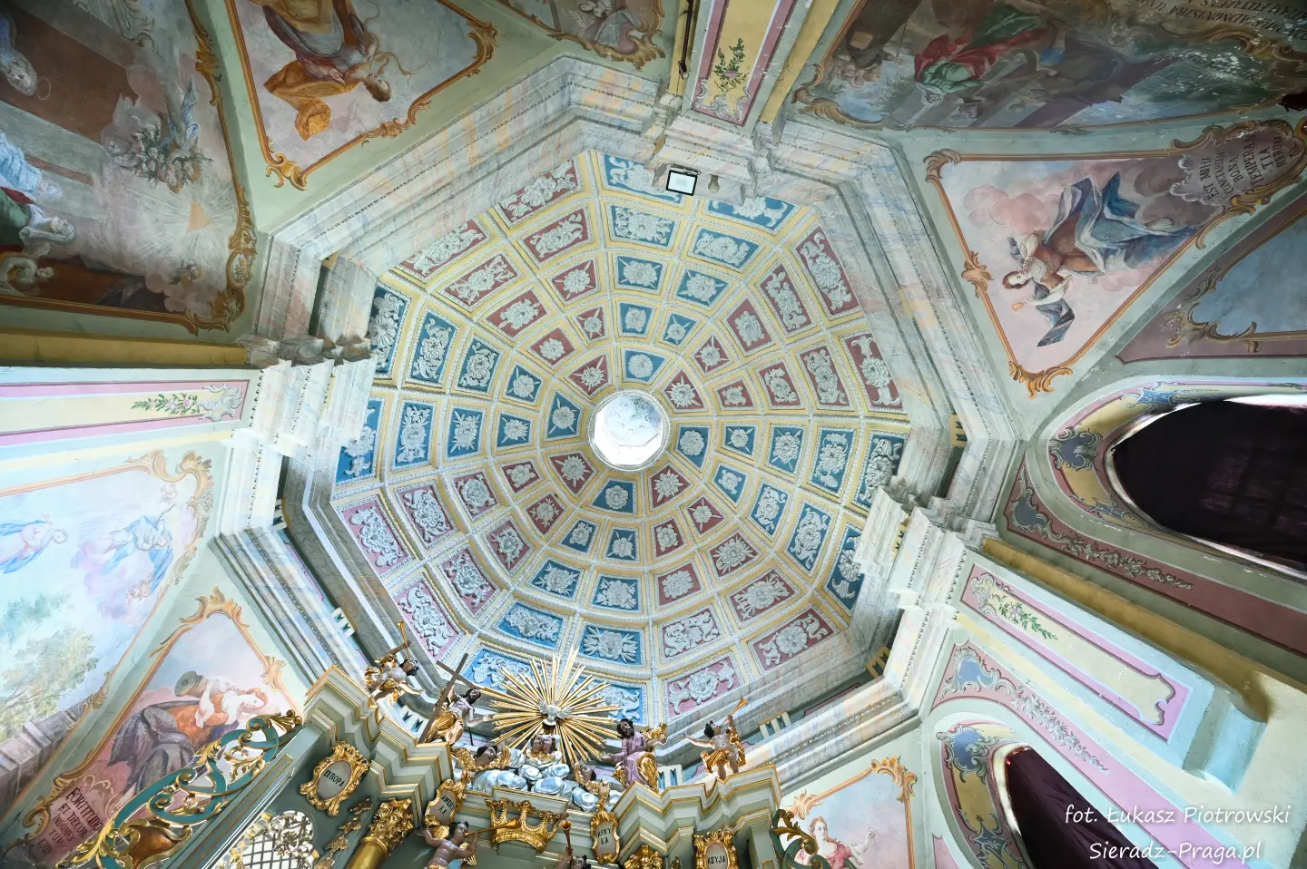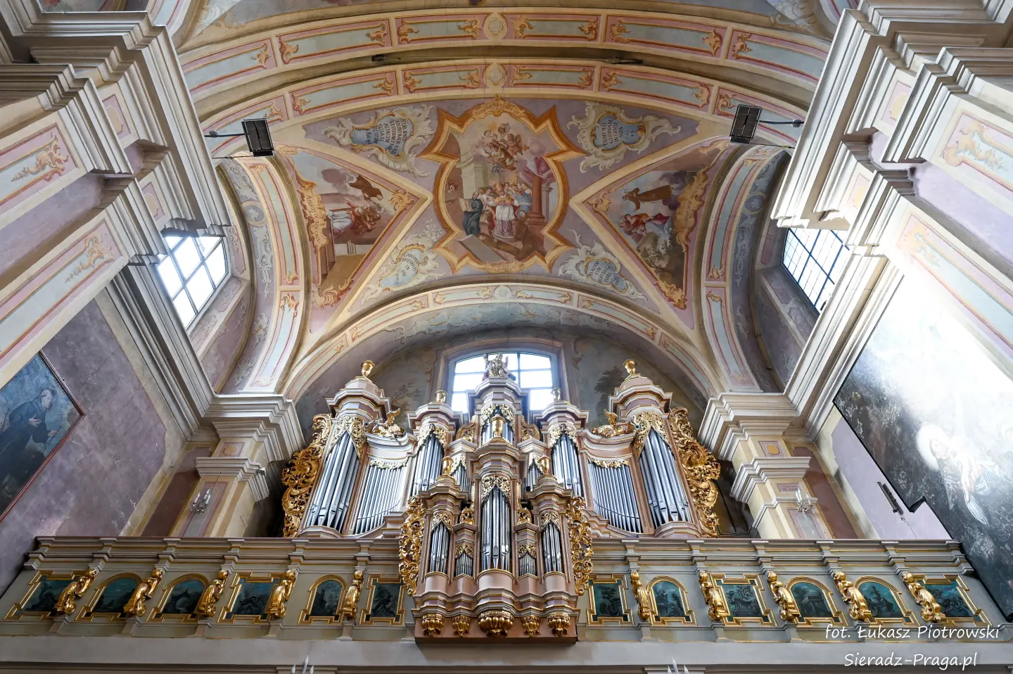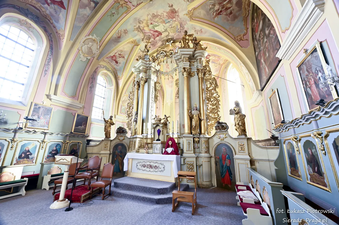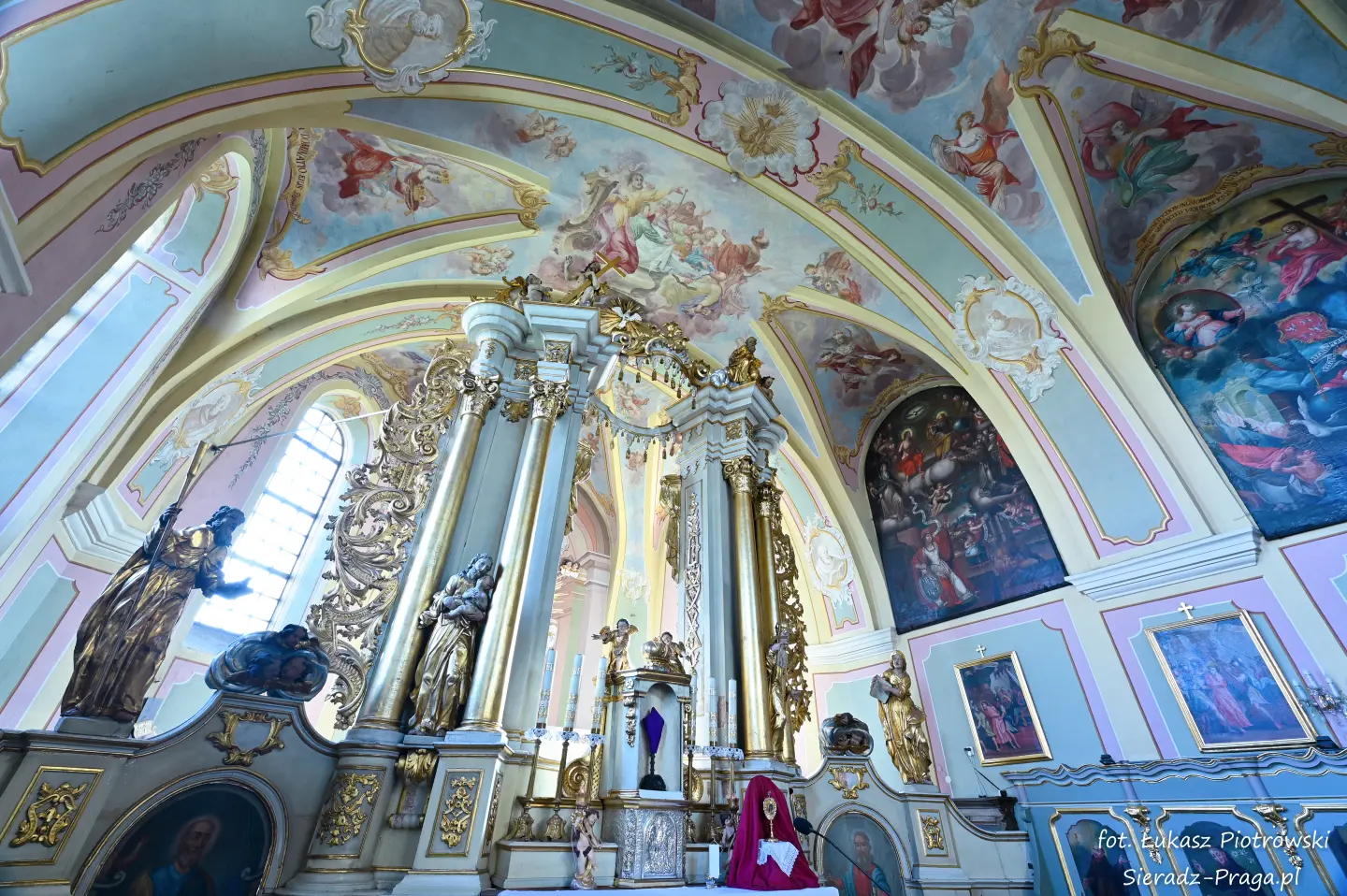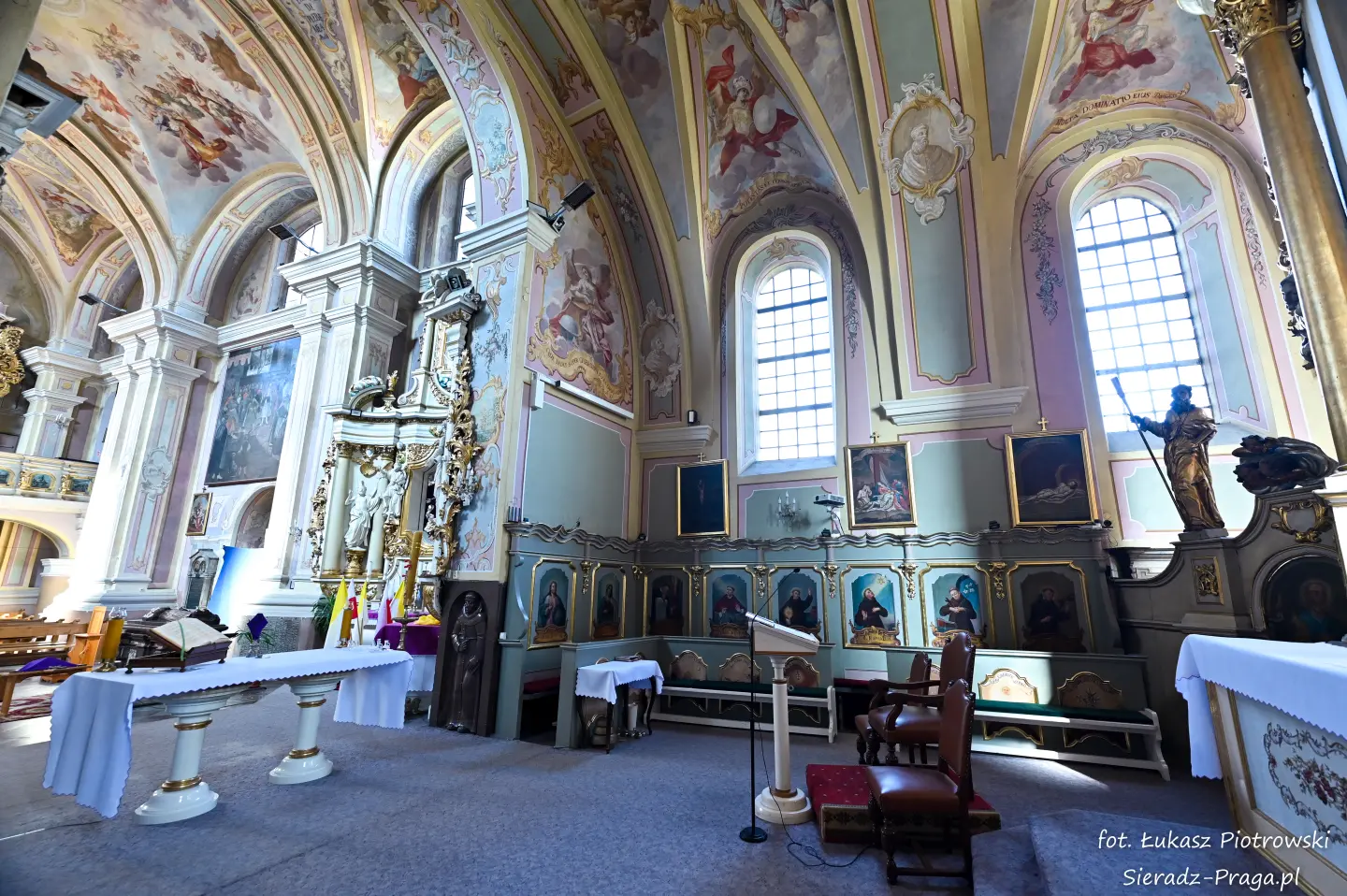 Dzisiaj pragnę przenieść się do niezwykłego miejsca, które jest oddalone od Sieradza jedynie o kilkanaście kilometrów. Tym miejscem jest wszystkim dobrze znany klasztor Ojców Bernardynów w Warcie, który jest również parafią pw. Najświętszej Maryi Panny. W ostatnich latach to miejsce stało mi się bliższe, a to za sprawą sąsiadujących z nim Sióstr Bernardynek, które 16 czerwca 2023 roku „ za sprawą” klasztoru Ojców Bernardynów mogłem pierwszy raz poznać. Od tamtego czasu stałem się częstszym bywalcem tych bliskich mojemu sercu miejsc. W klasztorze u Ojców Bernardynów bywałem też już wcześniej, a pierwsze zdjęcia z wnętrza kościoła wykonałem 8 listopada 2019 roku. Natomiast 18 września i 14 listopada 2024 roku nagrałem dronem z zewnątrz i wewnątrz kościoła filmy. To wszystko, o czym wspominam, możecie, Drodzy Czytelnicy, obejrzeć, klikając tutaj. Jednak oprócz zdjęć i filmów ukazujących piękno tego miejsca brakowało jeszcze czegoś. Tym brakującym elementem warckiego klasztoru są piękne malowidła ścienne kościoła. I to im pragnę poświęcić obecną zakładkę.