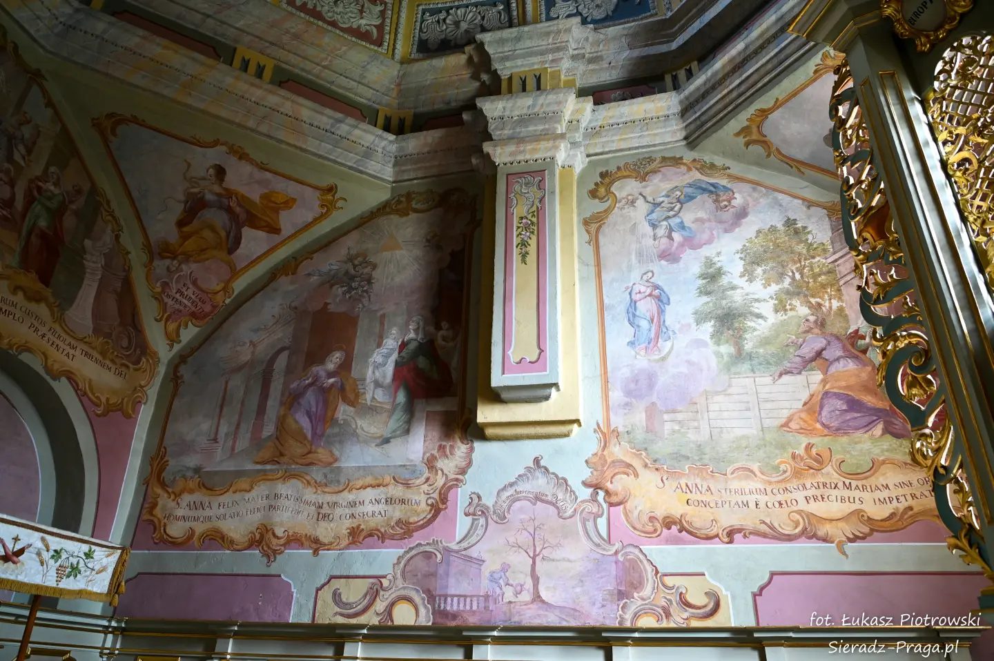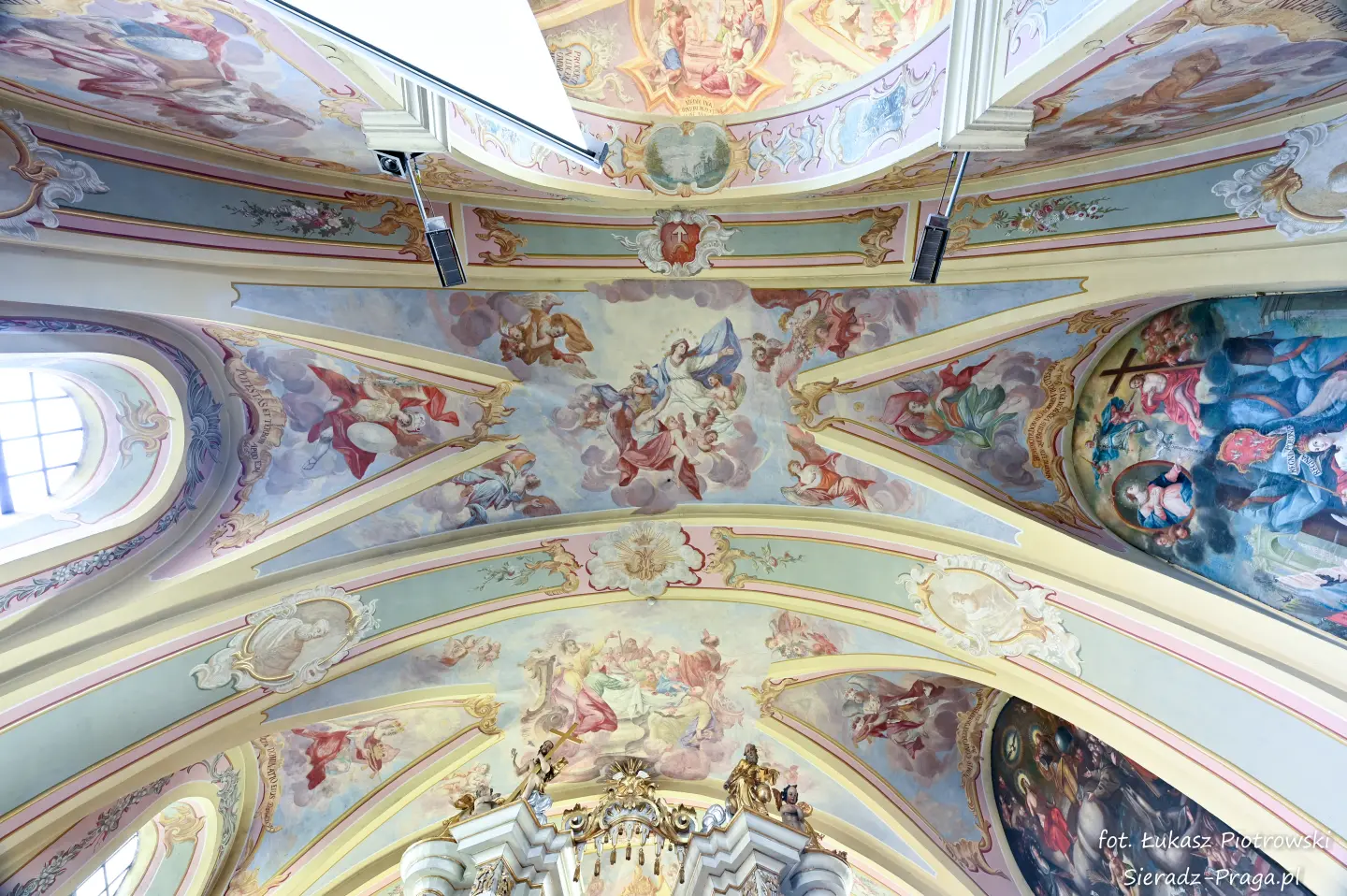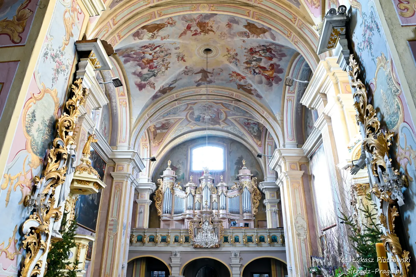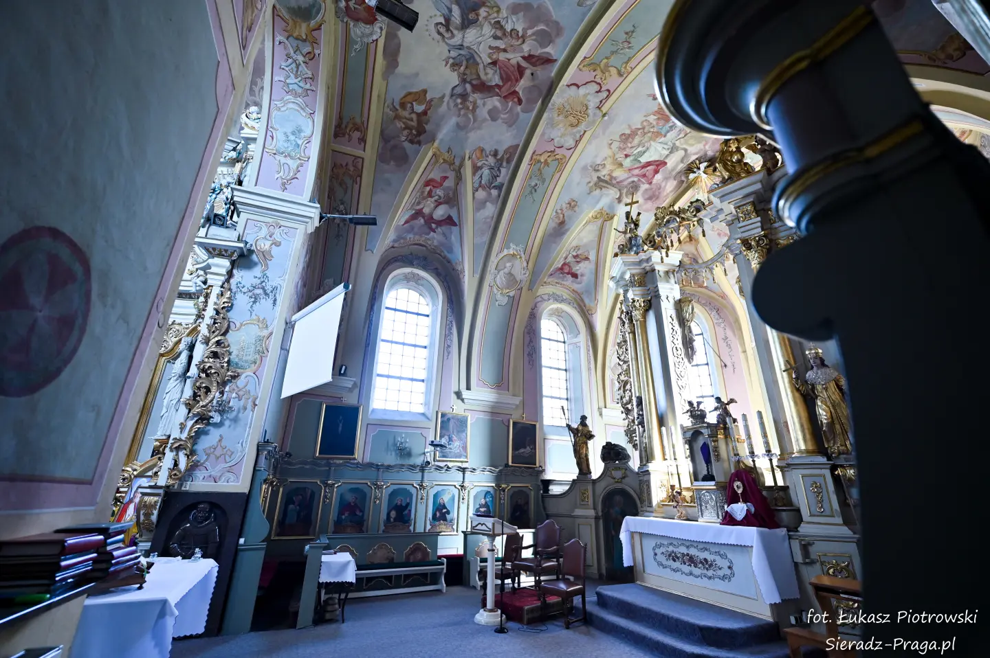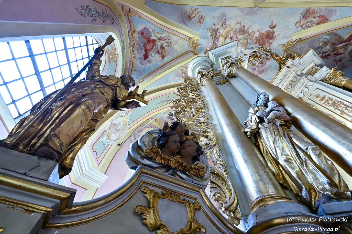 Dzisiaj pragnę przenieść się do niezwykłego miejsca, które jest oddalone od Sieradza jedynie o kilkanaście kilometrów. Tym miejscem jest wszystkim dobrze znany klasztor Ojców Bernardynów w Warcie, który jest również parafią pw. Najświętszej Maryi Panny. W ostatnich latach to miejsce stało mi się bliższe, a to za sprawą sąsiadujących z nim Sióstr Bernardynek, które 16 czerwca 2023 roku „ za sprawą” klasztoru Ojców Bernardynów mogłem pierwszy raz poznać. Od tamtego czasu stałem się częstszym bywalcem tych bliskich mojemu sercu miejsc. W klasztorze u Ojców Bernardynów bywałem też już wcześniej, a pierwsze zdjęcia z wnętrza kościoła wykonałem 8 listopada 2019 roku. Natomiast 18 września i 14 listopada 2024 roku nagrałem dronem z zewnątrz i wewnątrz kościoła filmy. To wszystko, o czym wspominam, możecie, Drodzy Czytelnicy, obejrzeć, klikając tutaj. Jednak oprócz zdjęć i filmów ukazujących piękno tego miejsca brakowało jeszcze czegoś. Tym brakującym elementem warckiego klasztoru są piękne malowidła ścienne kościoła. I to im pragnę poświęcić obecną zakładkę.