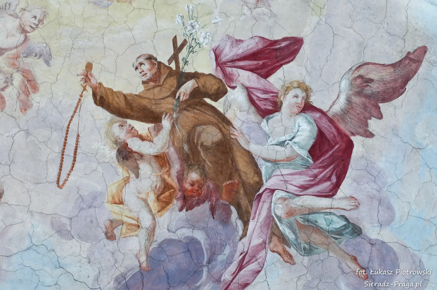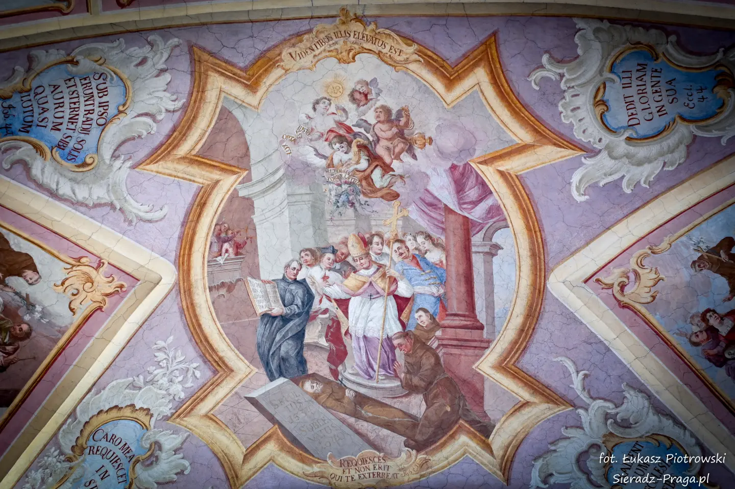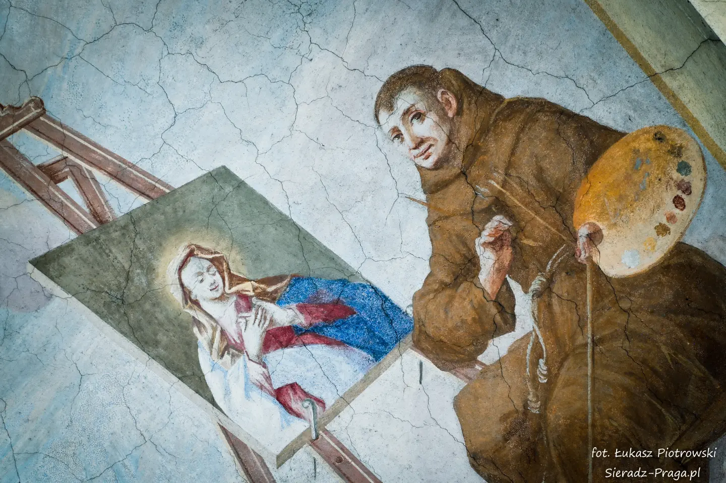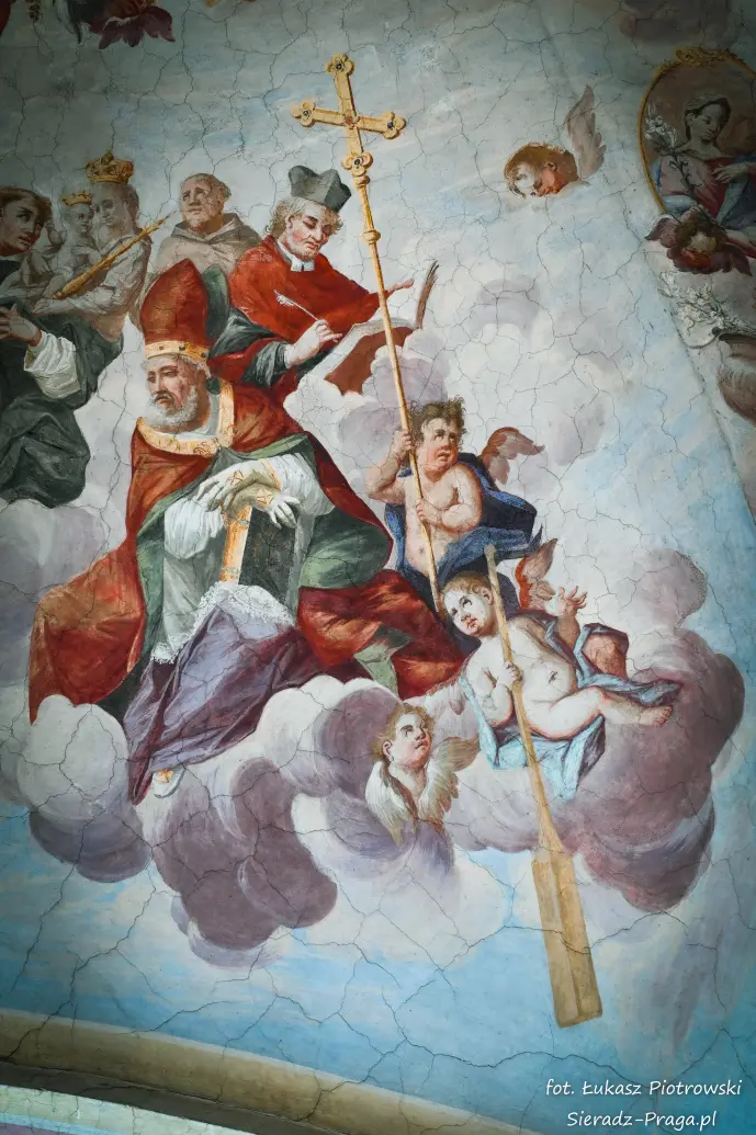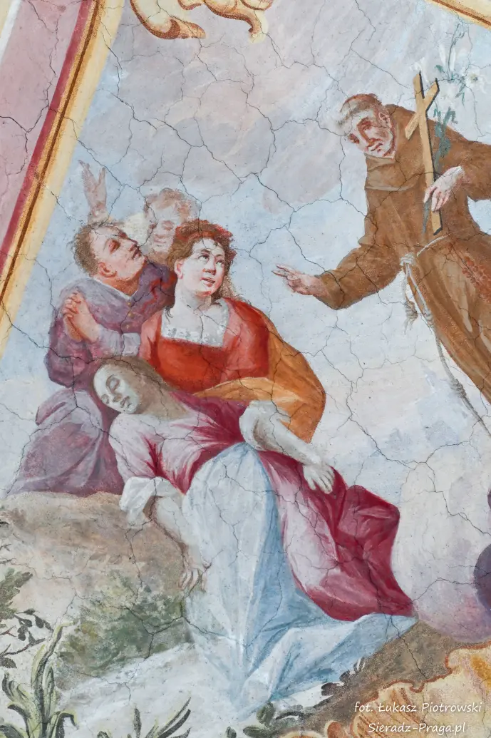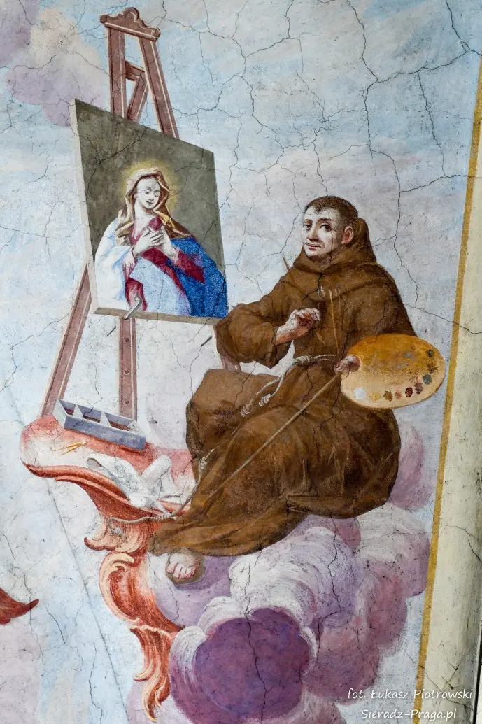 Malarze ukazują na polichromiach sklepień warckiego klasztoru sceny m.in. Wniebowzięcia NMP i dziewięć chórów anielskich, adorację Chrystusa Ukrzyżowanego przez świętych i aniołów, wizję Nieba z polskimi świętymi i błogosławionymi. Jest również ukazane na sklepieniach życie i cuda Sługi Bożego Rafała z Proszowic, którego kult trwa nieprzerwanie od XVI wieku, a w kaplicy św. Anny możemy podziwiać sceny z życia matki Maryi, a zarazem babci Jezusa i personifikacje czterech cnót kardynalnych. W tym miejscu kieruję podziękowania dla mojego serdecznego kolegi dr. hab Pawła Migasiewicza, sieradzanina, a zarazem profesora pracującego w Polskiej Akademii Nauk w Warszawie za zawsze okazywaną mi pomoc.