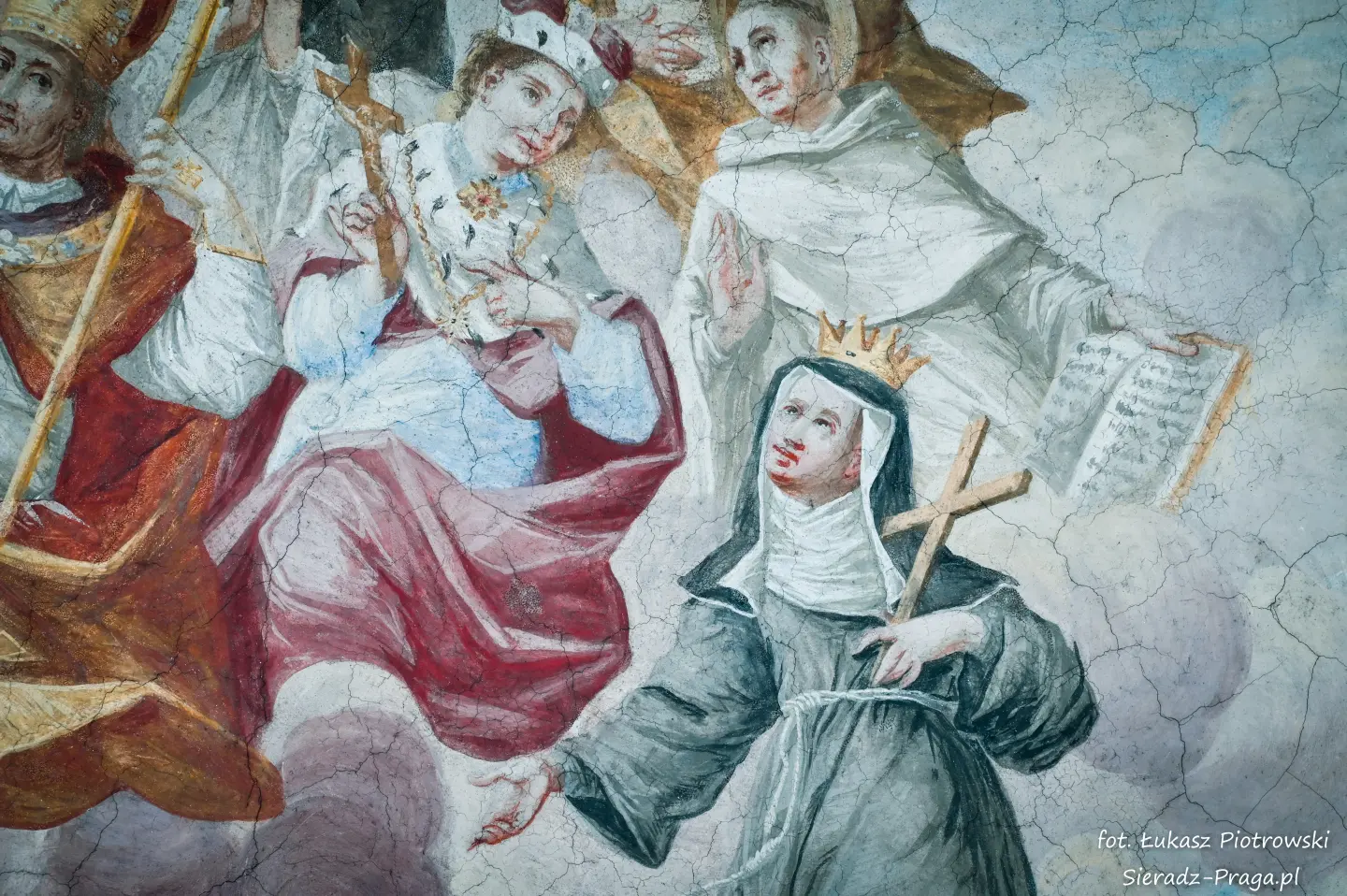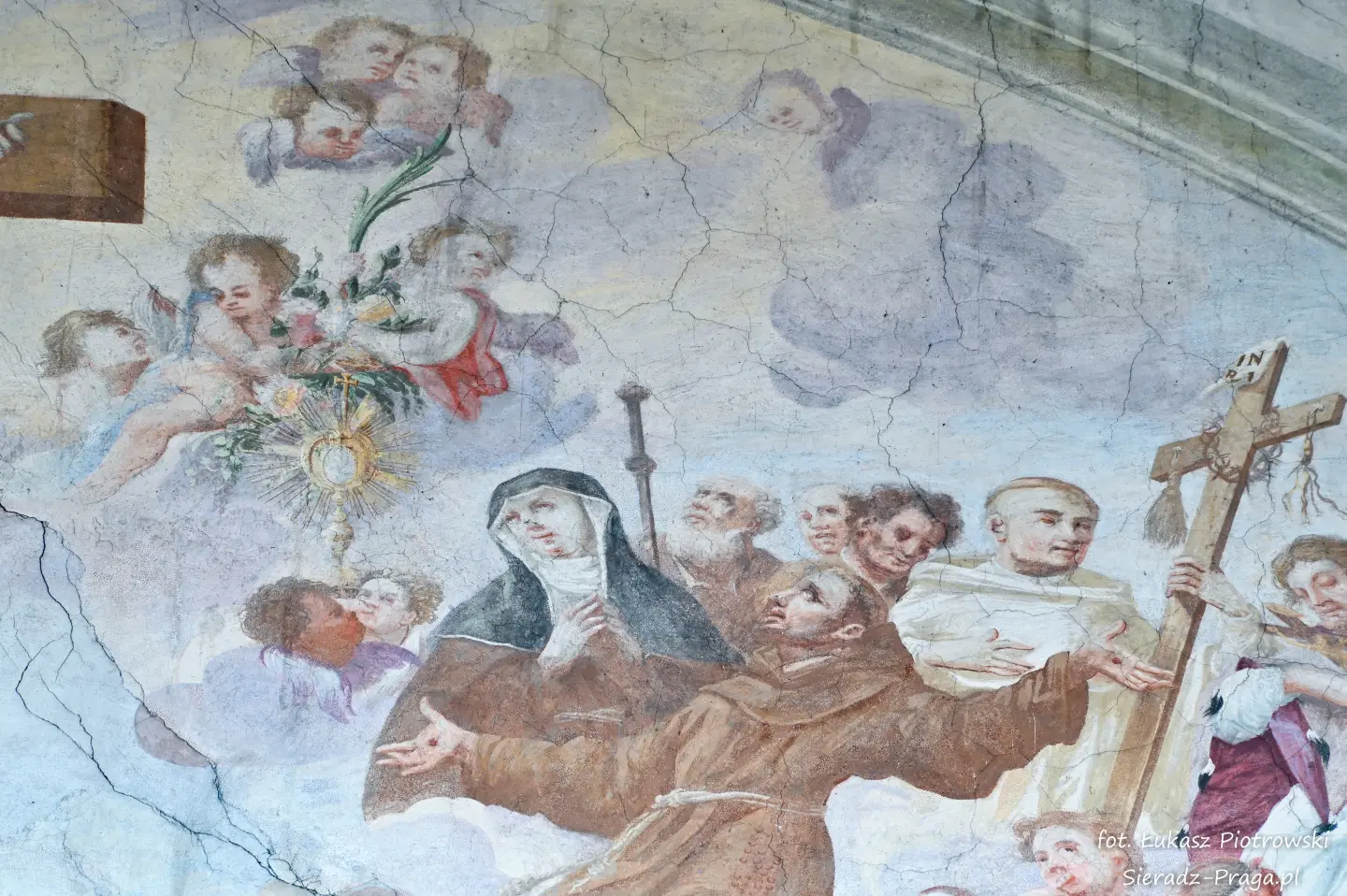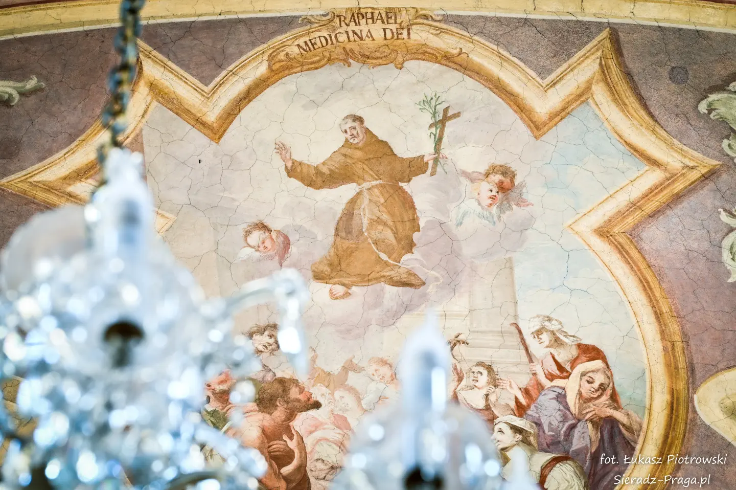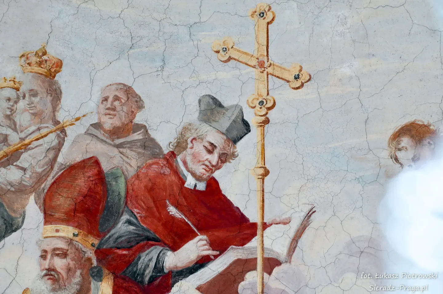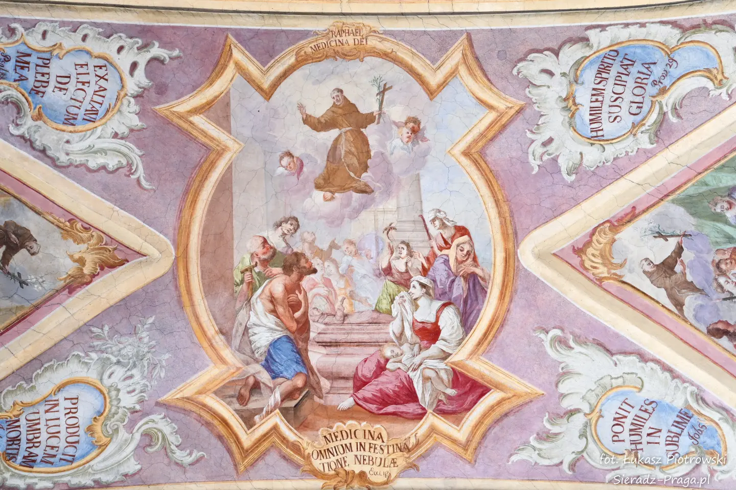 Malarze ukazują na polichromiach sklepień warckiego klasztoru sceny m.in. Wniebowzięcia NMP i dziewięć chórów anielskich, adorację Chrystusa Ukrzyżowanego przez świętych i aniołów, wizję Nieba z polskimi świętymi i błogosławionymi. Jest również ukazane na sklepieniach życie i cuda Sługi Bożego Rafała z Proszowic, którego kult trwa nieprzerwanie od XVI wieku, a w kaplicy św. Anny możemy podziwiać sceny z życia matki Maryi, a zarazem babci Jezusa i personifikacje czterech cnót kardynalnych. W tym miejscu kieruję podziękowania dla mojego serdecznego kolegi dr. hab Pawła Migasiewicza, sieradzanina, a zarazem profesora pracującego w Polskiej Akademii Nauk w Warszawie za zawsze okazywaną mi pomoc.