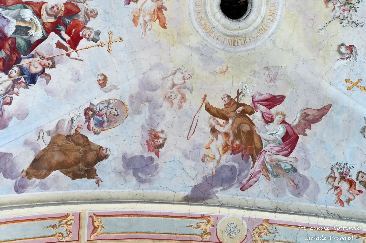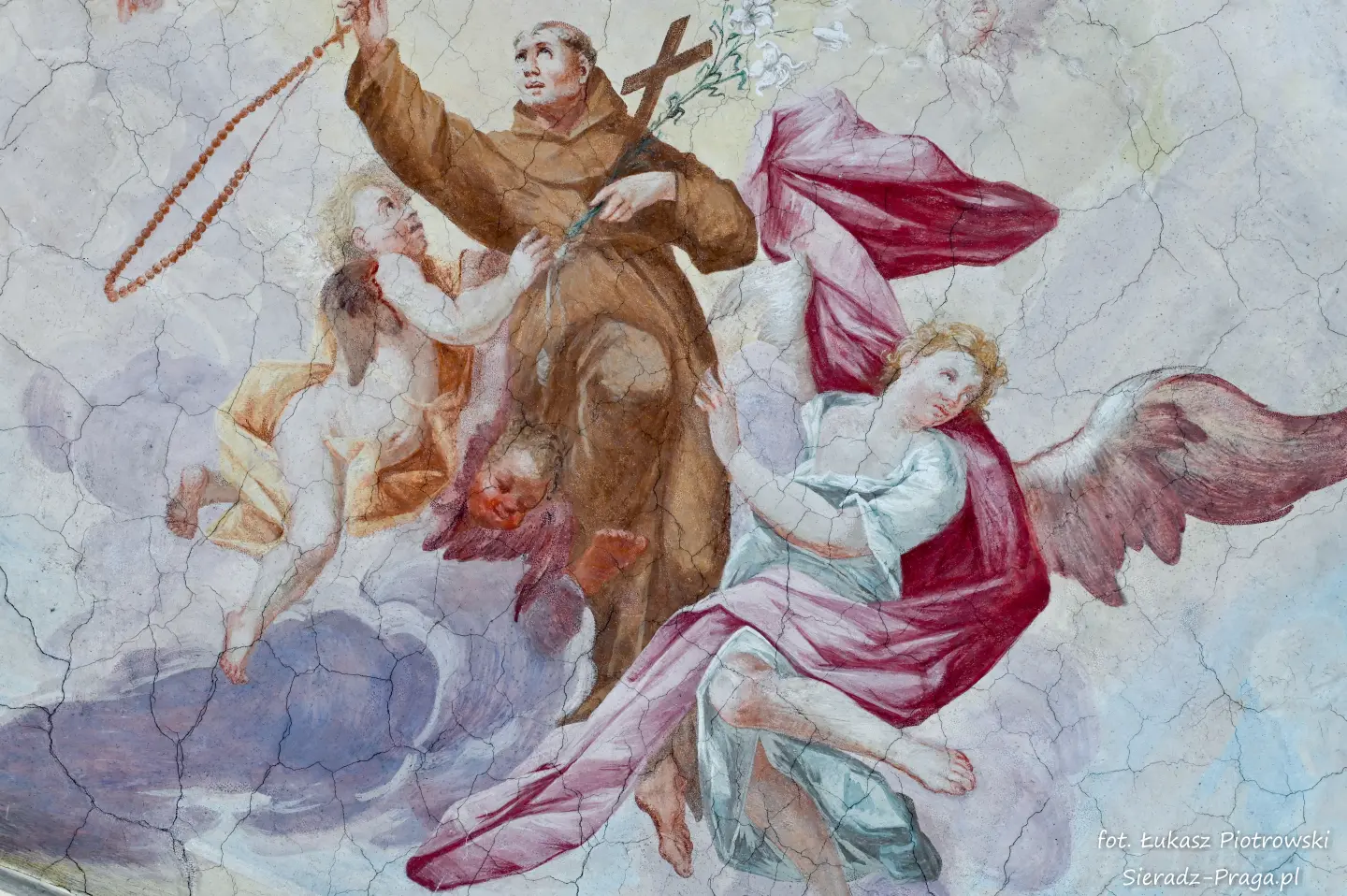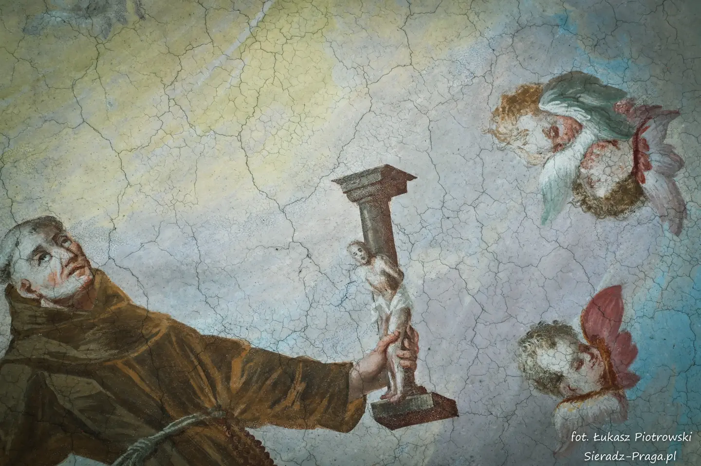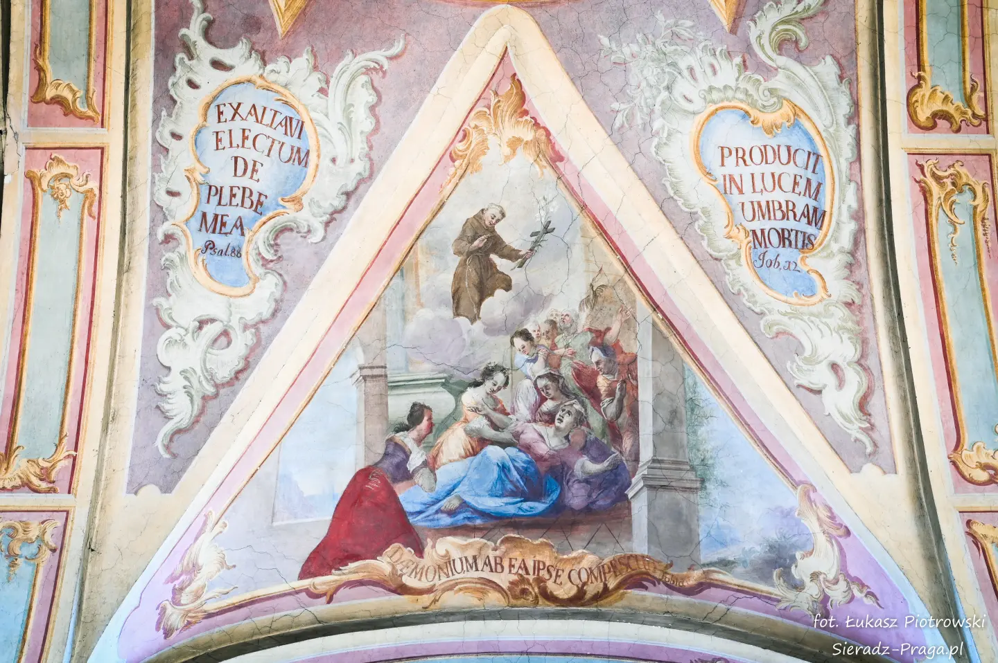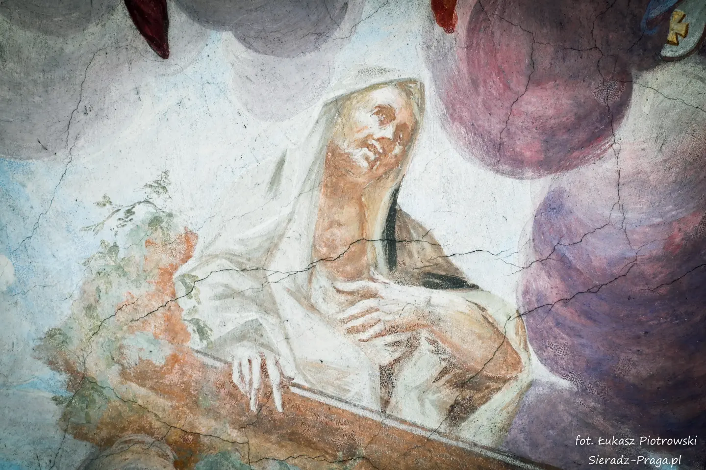 Malarze ukazują na polichromiach sklepień warckiego klasztoru sceny m.in. Wniebowzięcia NMP i dziewięć chórów anielskich, adorację Chrystusa Ukrzyżowanego przez świętych i aniołów, wizję Nieba z polskimi świętymi i błogosławionymi. Jest również ukazane na sklepieniach życie i cuda Sługi Bożego Rafała z Proszowic, którego kult trwa nieprzerwanie od XVI wieku, a w kaplicy św. Anny możemy podziwiać sceny z życia matki Maryi, a zarazem babci Jezusa i personifikacje czterech cnót kardynalnych. W tym miejscu kieruję podziękowania dla mojego serdecznego kolegi dr. hab Pawła Migasiewicza, sieradzanina, a zarazem profesora pracującego w Polskiej Akademii Nauk w Warszawie za zawsze okazywaną mi pomoc.
