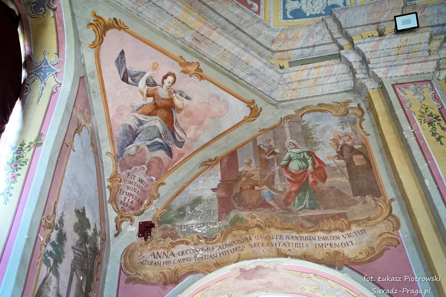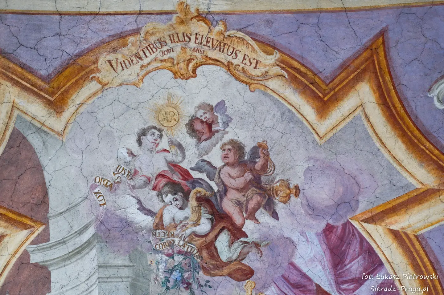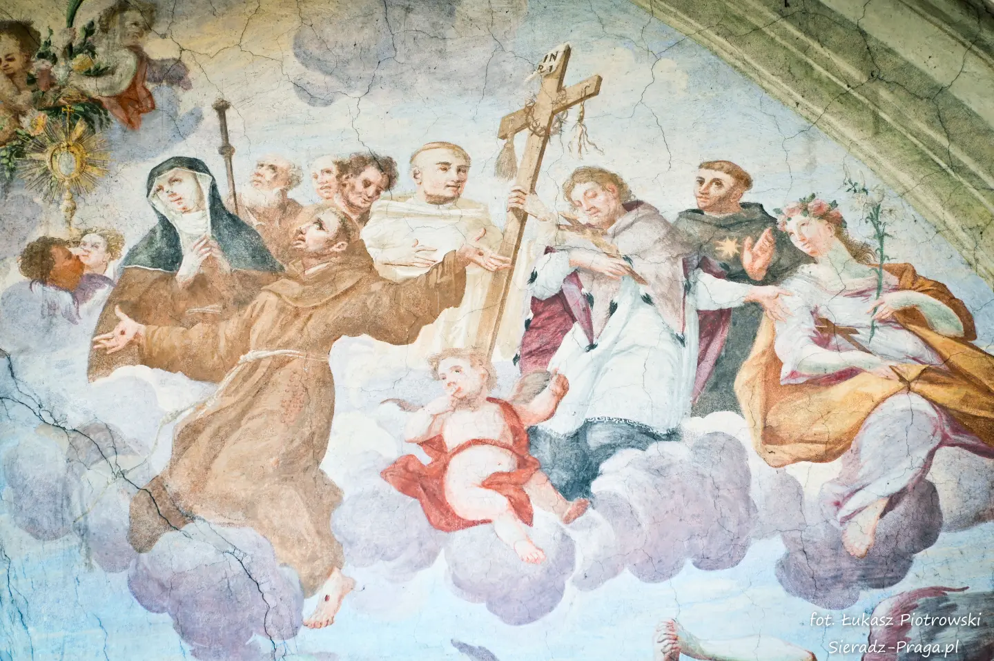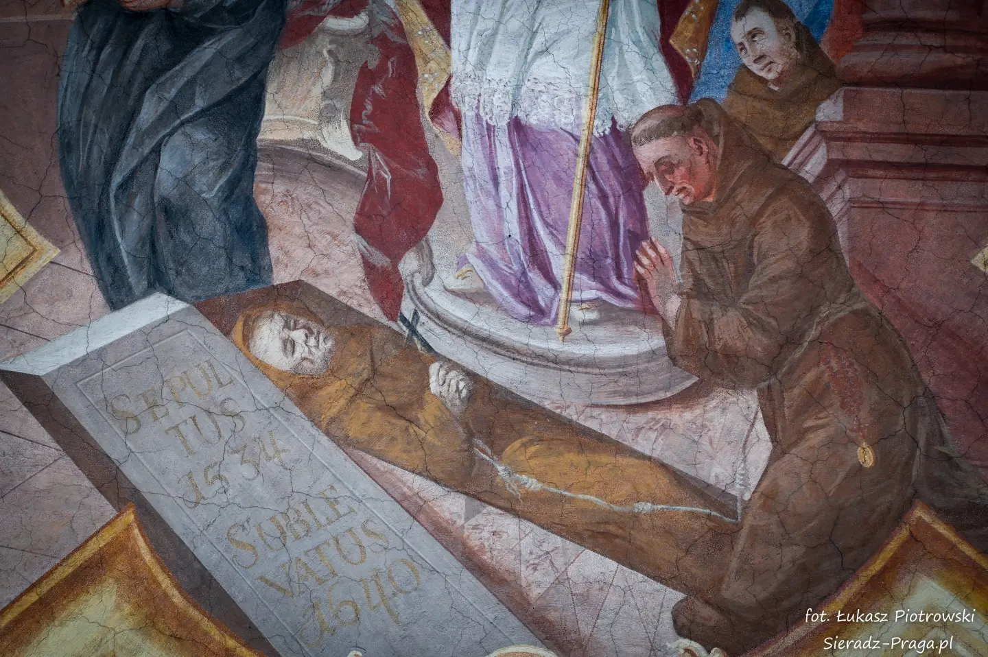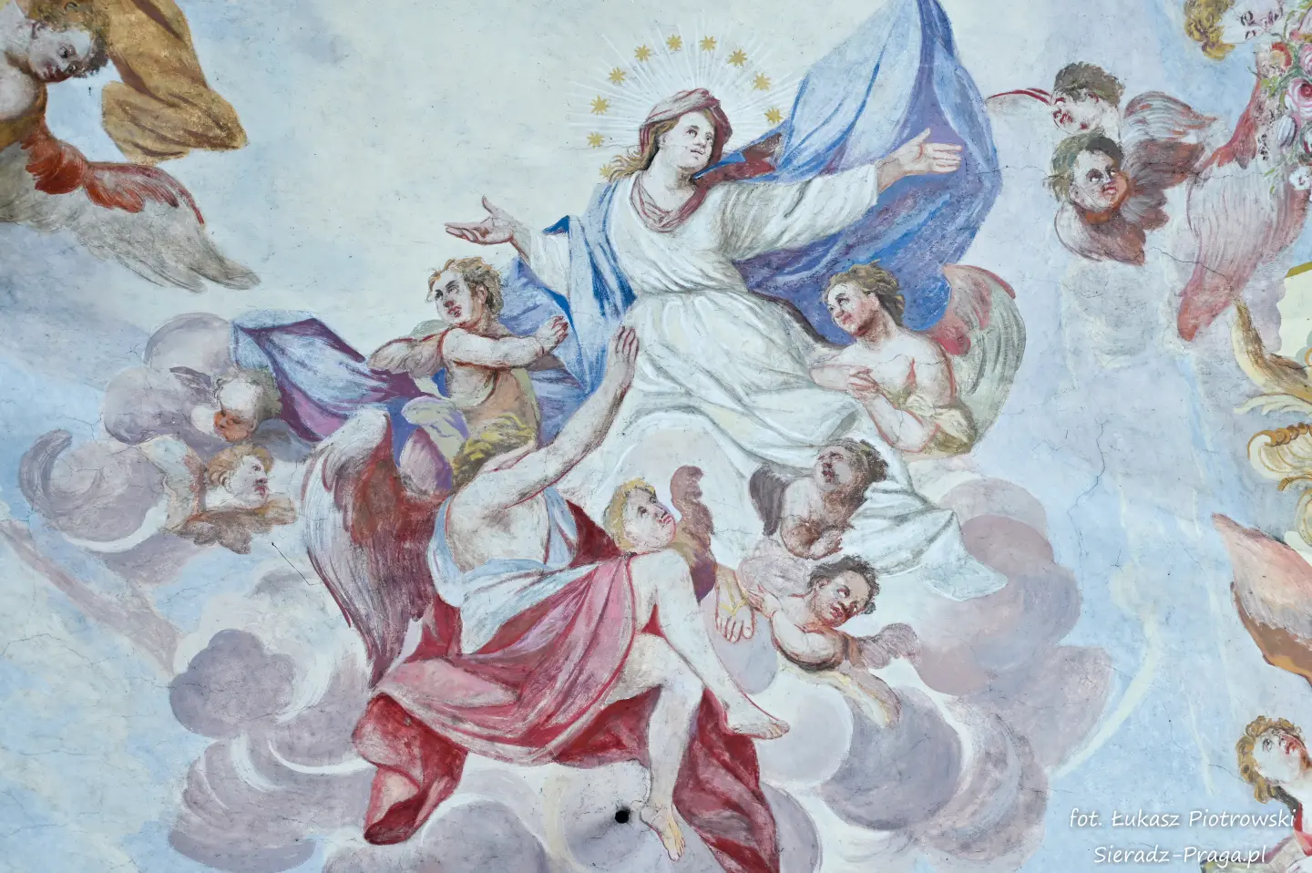 Malarze ukazują na polichromiach sklepień warckiego klasztoru sceny m.in. Wniebowzięcia NMP i dziewięć chórów anielskich, adorację Chrystusa Ukrzyżowanego przez świętych i aniołów, wizję Nieba z polskimi świętymi i błogosławionymi. Jest również ukazane na sklepieniach życie i cuda Sługi Bożego Rafała z Proszowic, którego kult trwa nieprzerwanie od XVI wieku, a w kaplicy św. Anny możemy podziwiać sceny z życia matki Maryi, a zarazem babci Jezusa i personifikacje czterech cnót kardynalnych. W tym miejscu kieruję podziękowania dla mojego serdecznego kolegi dr. hab Pawła Migasiewicza, sieradzanina, a zarazem profesora pracującego w Polskiej Akademii Nauk w Warszawie za zawsze okazywaną mi pomoc.
