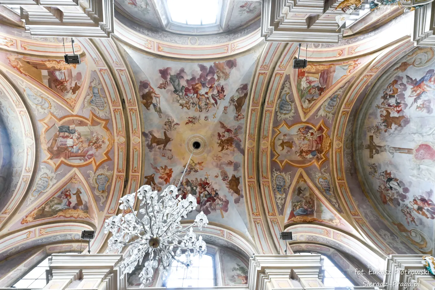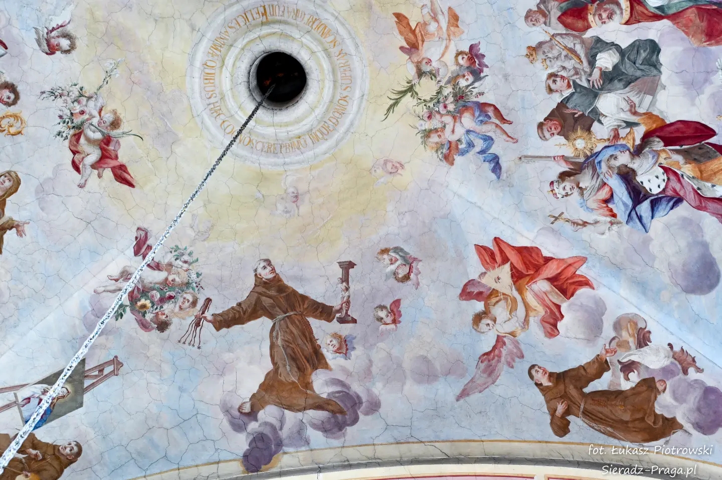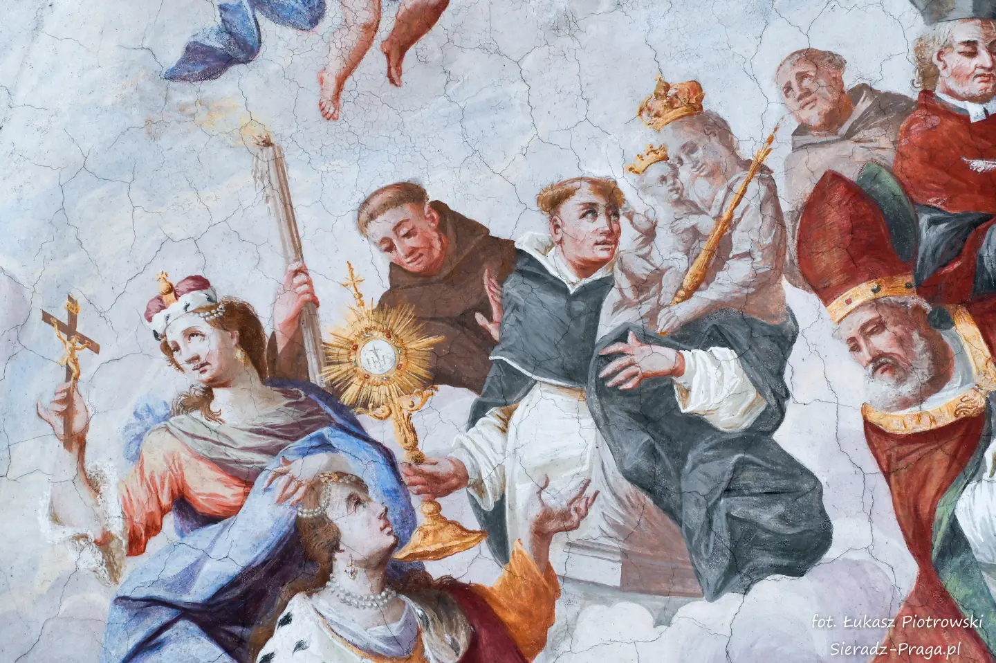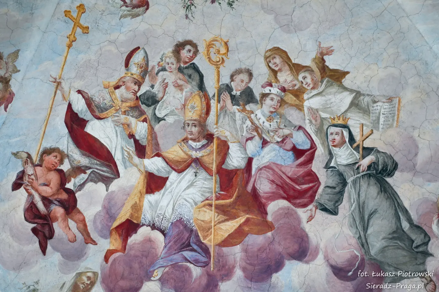 Malarze ukazują na polichromiach sklepień warckiego klasztoru sceny m.in. Wniebowzięcia NMP i dziewięć chórów anielskich, adorację Chrystusa Ukrzyżowanego przez świętych i aniołów, wizję Nieba z polskimi świętymi i błogosławionymi. Jest również ukazane na sklepieniach życie i cuda Sługi Bożego Rafała z Proszowic, którego kult trwa nieprzerwanie od XVI wieku, a w kaplicy św. Anny możemy podziwiać sceny z życia matki Maryi, a zarazem babci Jezusa i personifikacje czterech cnót kardynalnych. W tym miejscu kieruję podziękowania dla mojego serdecznego kolegi dr. hab Pawła Migasiewicza, sieradzanina, a zarazem profesora pracującego w Polskiej Akademii Nauk w Warszawie za zawsze okazywaną mi pomoc.