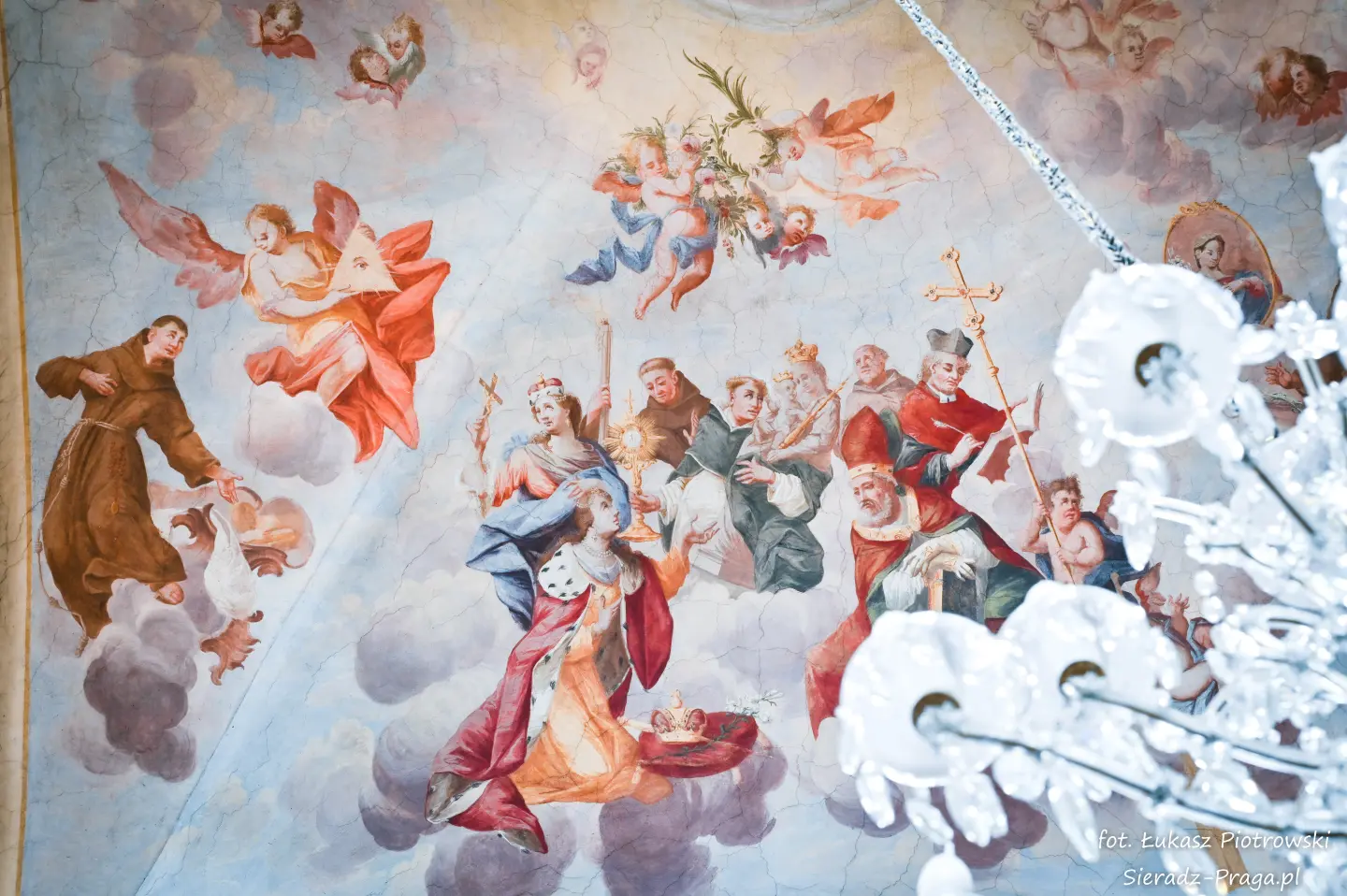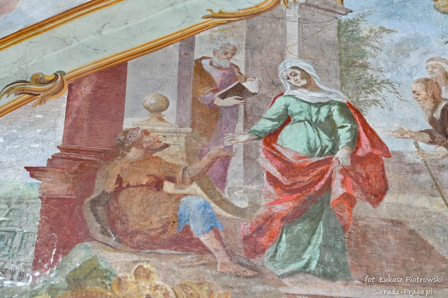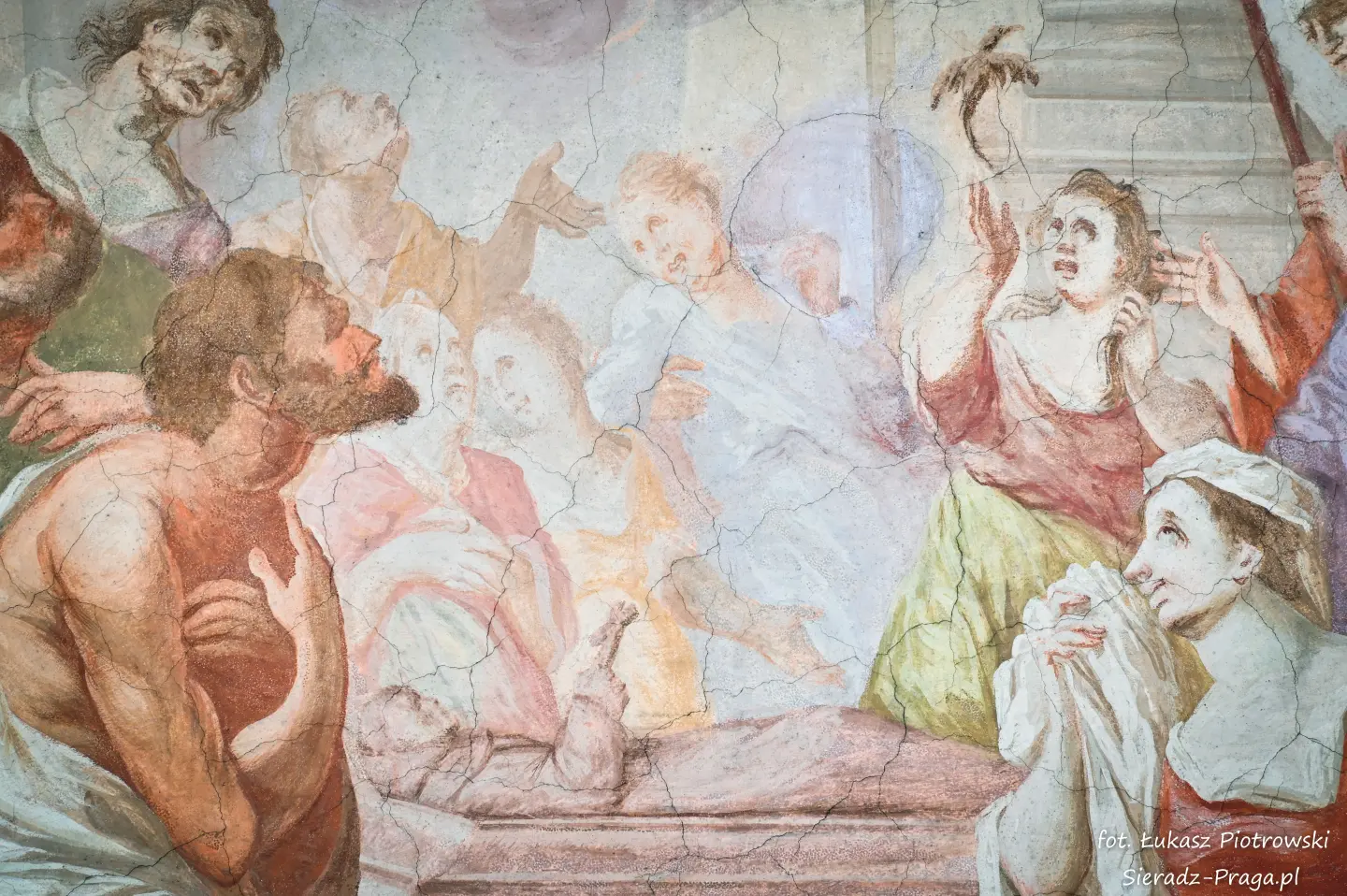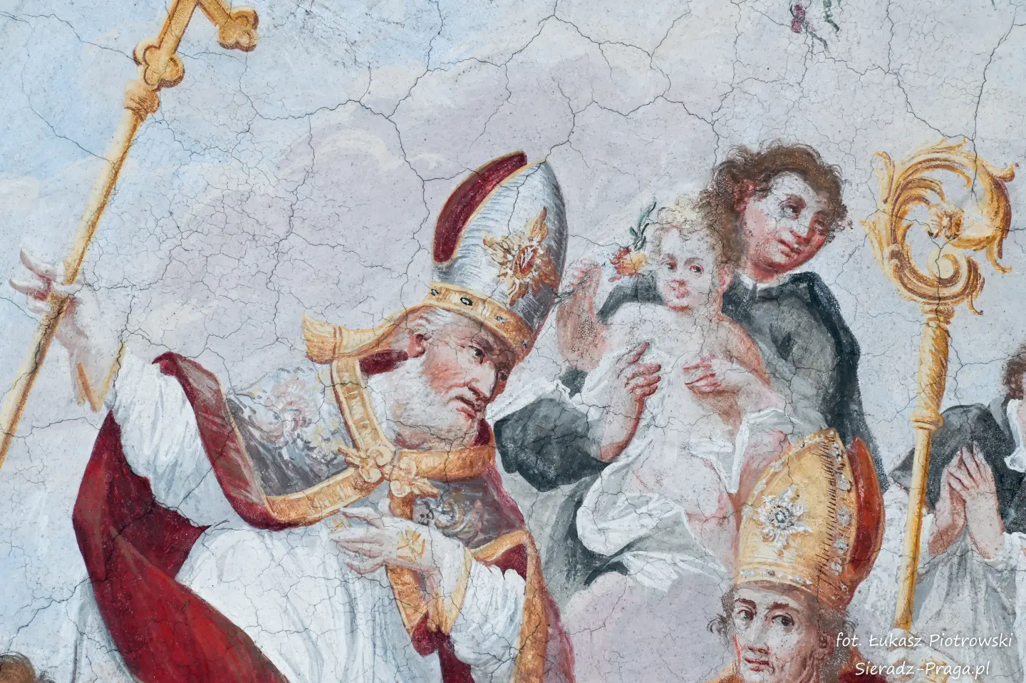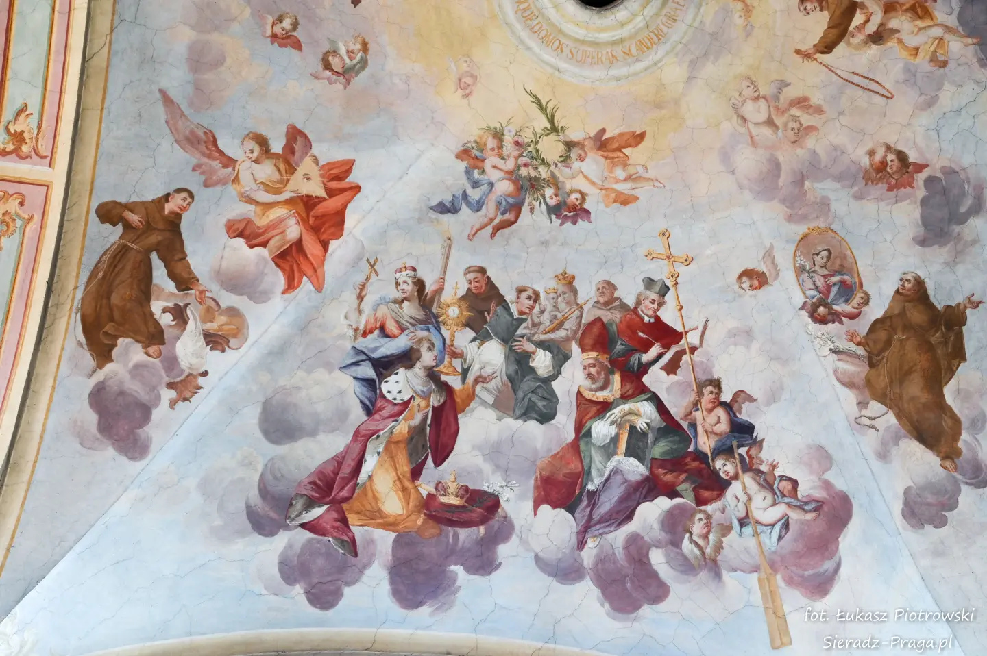 Malarze ukazują na polichromiach sklepień warckiego klasztoru sceny m.in. Wniebowzięcia NMP i dziewięć chórów anielskich, adorację Chrystusa Ukrzyżowanego przez świętych i aniołów, wizję Nieba z polskimi świętymi i błogosławionymi. Jest również ukazane na sklepieniach życie i cuda Sługi Bożego Rafała z Proszowic, którego kult trwa nieprzerwanie od XVI wieku, a w kaplicy św. Anny możemy podziwiać sceny z życia matki Maryi, a zarazem babci Jezusa i personifikacje czterech cnót kardynalnych. W tym miejscu kieruję podziękowania dla mojego serdecznego kolegi dr. hab Pawła Migasiewicza, sieradzanina, a zarazem profesora pracującego w Polskiej Akademii Nauk w Warszawie za zawsze okazywaną mi pomoc.