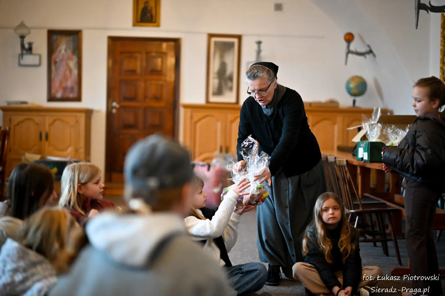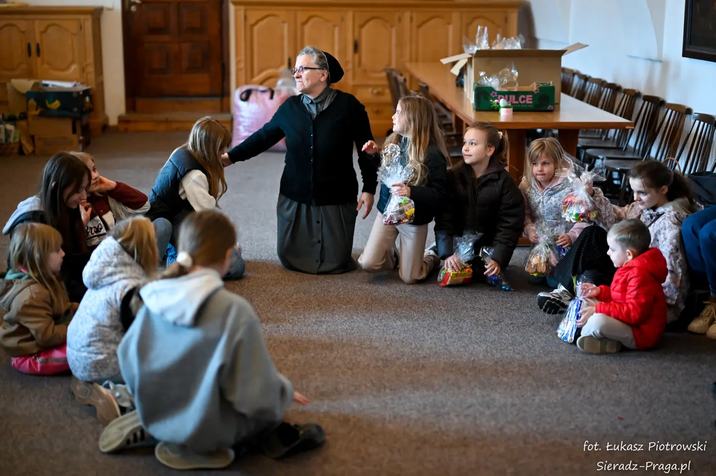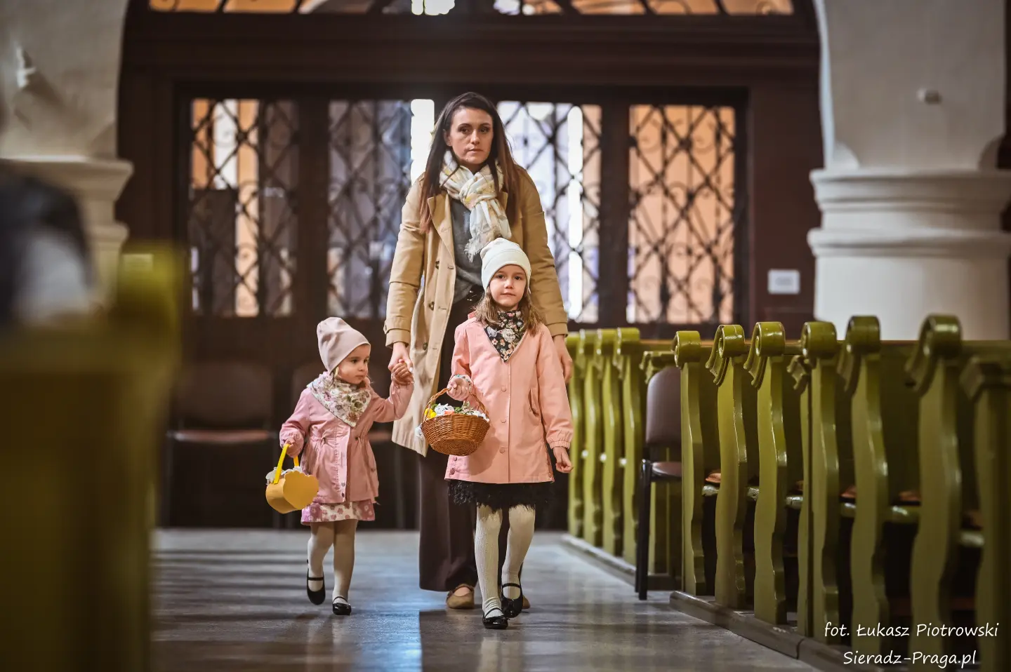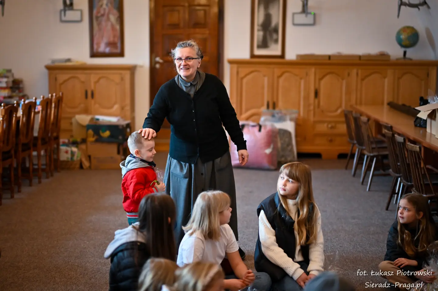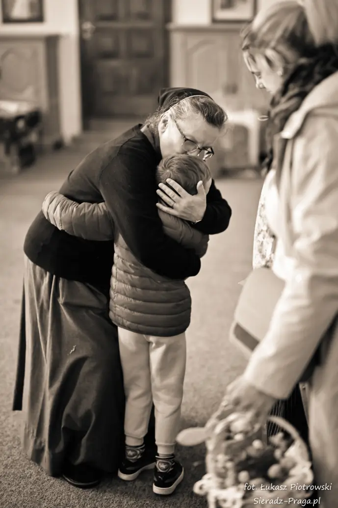 W tym szczególnym czasie pragnę zaprosić do kontemplacji chwil utrwalonych w klasztorze Sióstr Urszulanek, gdzie ks. Zygmunt Majdziński, sprawujący duchową opiekę nad wspólnotą, pobłogosławił to, co znajdzie się na wielkanocnych stołach. To sacrum przeplata się z czystą radością życia, co widać szczególnie w spotkaniu s. Elżbiety Kuriatto z dziećmi z jej scholi. Siostra Elżbieta, obdarzona niezwykłym darem serca, z matczyną czułością prowadzi te młode dusze ku Bogu, ucząc je, jak swoim śpiewem uwielbiać Stwórcę w sieradzkiej bazylice. Słodkie upominki, które otrzymały dzieci, stały się jedynie skromnym znakiem obfitości łask, jakimi obdarza nas Zmartwychwstały.