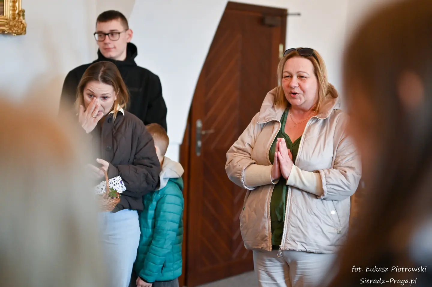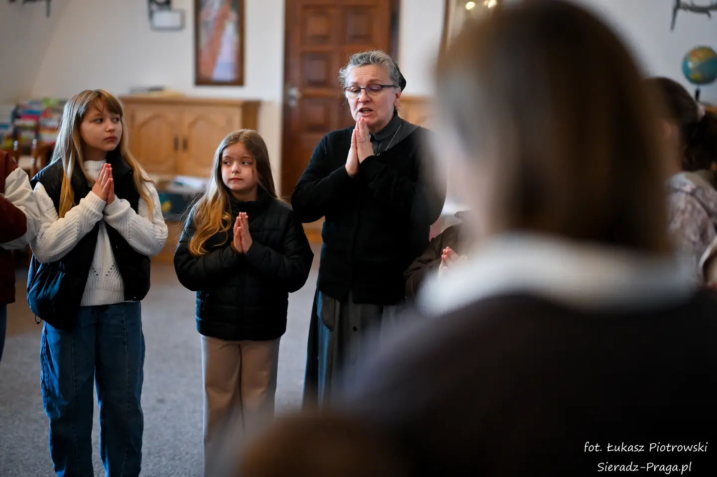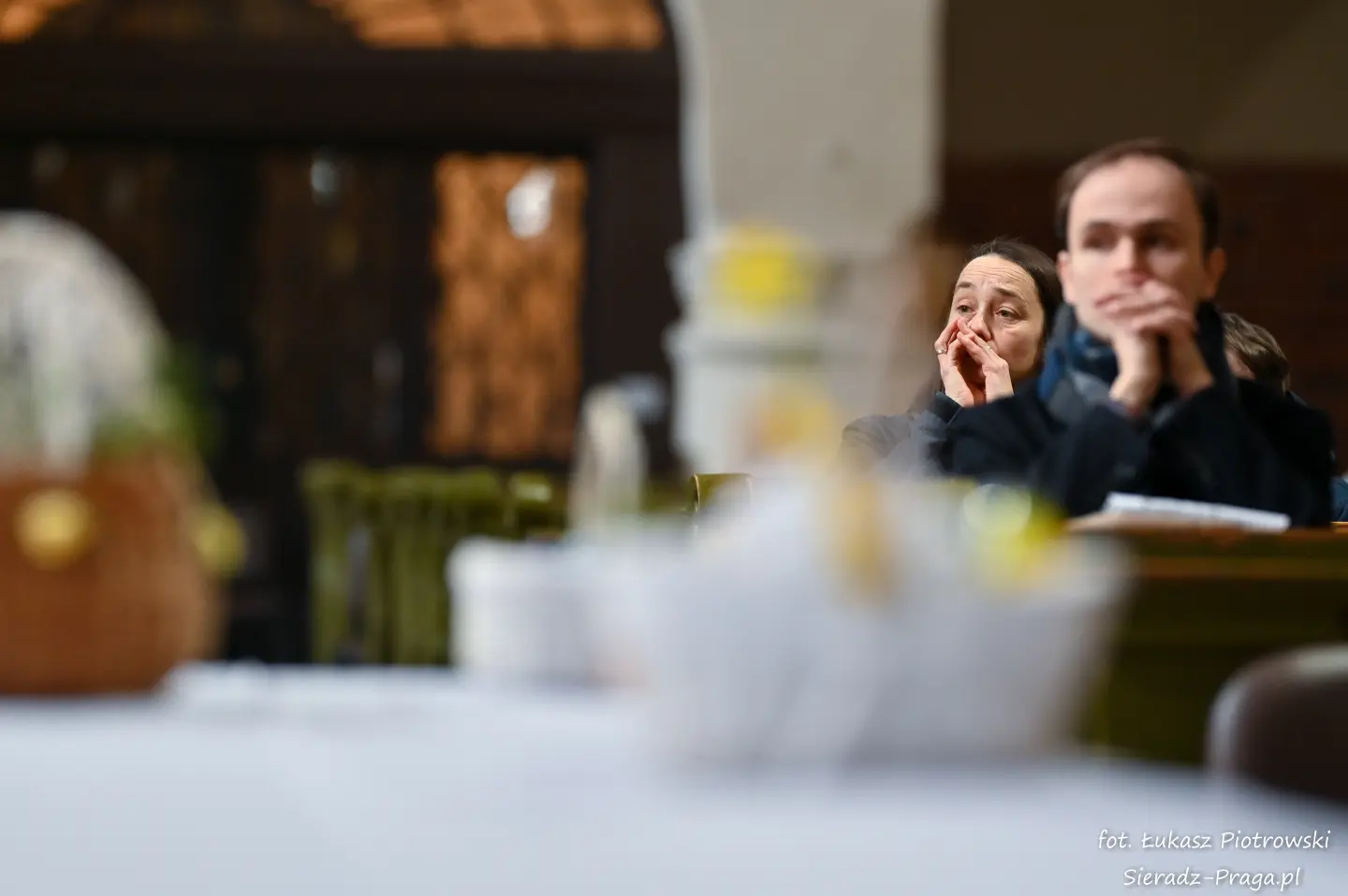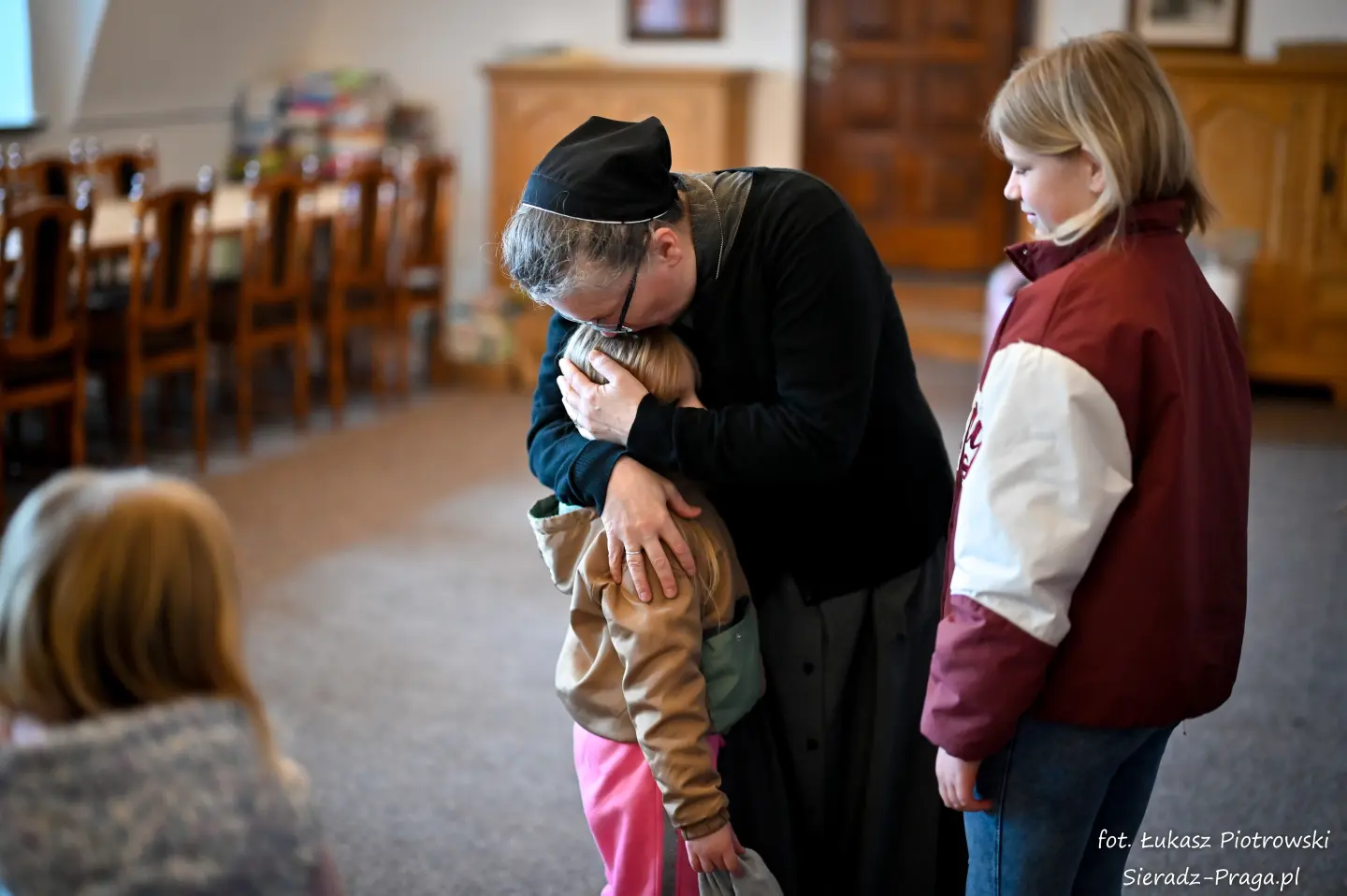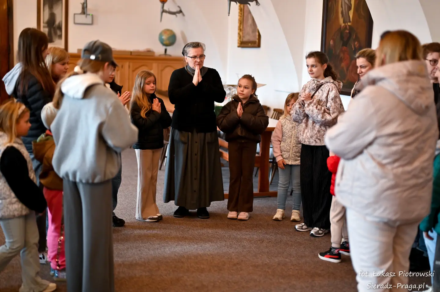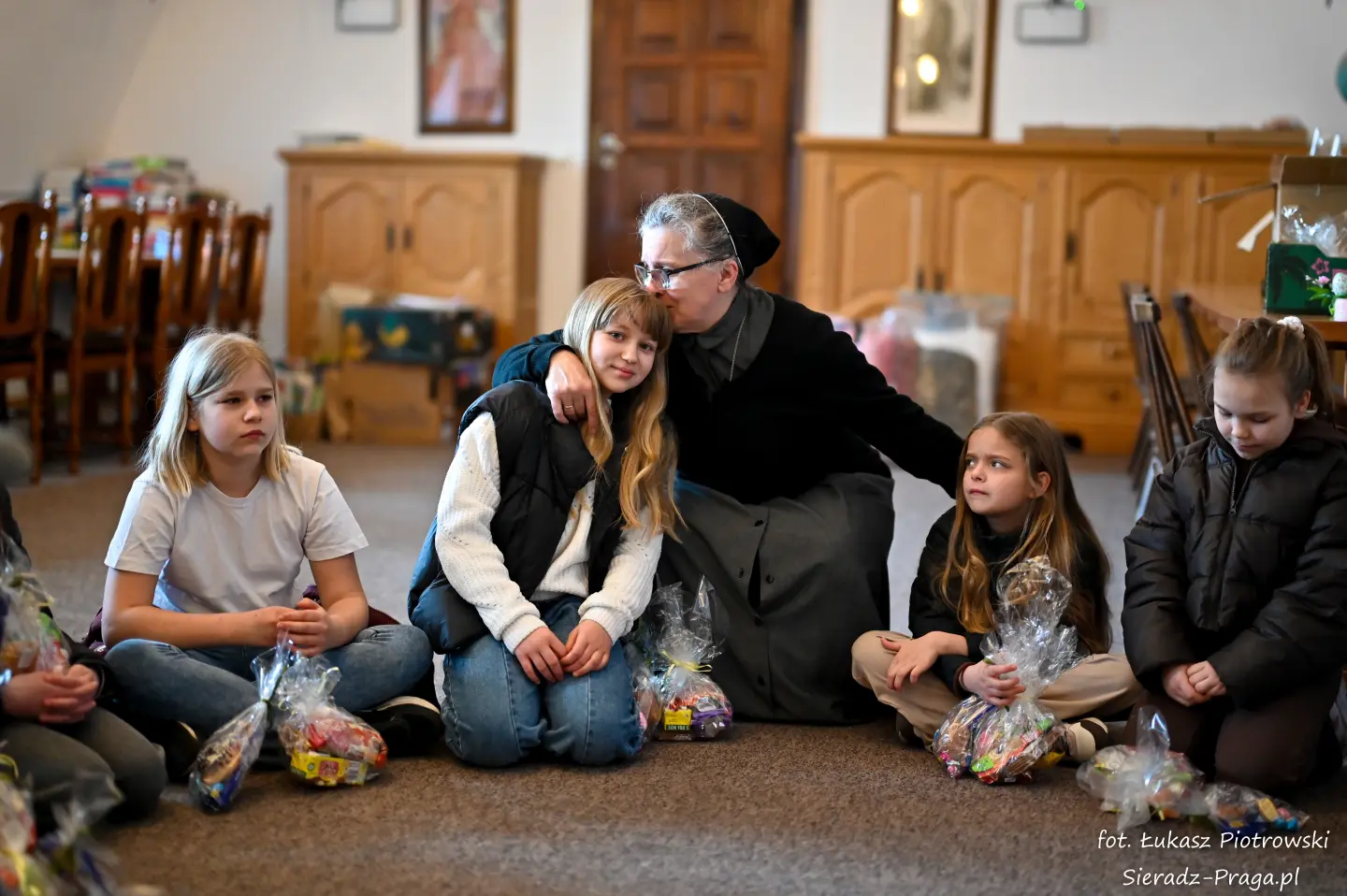 W tym szczególnym czasie pragnę zaprosić do kontemplacji chwil utrwalonych w klasztorze Sióstr Urszulanek, gdzie ks. Zygmunt Majdziński, sprawujący duchową opiekę nad wspólnotą, pobłogosławił to, co znajdzie się na wielkanocnych stołach. To sacrum przeplata się z czystą radością życia, co widać szczególnie w spotkaniu s. Elżbiety Kuriatto z dziećmi z jej scholi. Siostra Elżbieta, obdarzona niezwykłym darem serca, z matczyną czułością prowadzi te młode dusze ku Bogu, ucząc je, jak swoim śpiewem uwielbiać Stwórcę w sieradzkiej bazylice. Słodkie upominki, które otrzymały dzieci, stały się jedynie skromnym znakiem obfitości łask, jakimi obdarza nas Zmartwychwstały.
